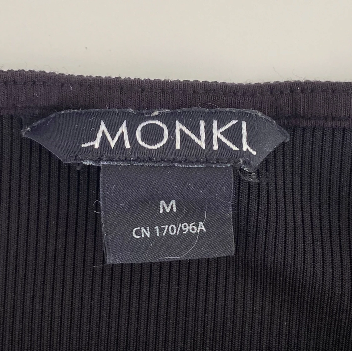 Säljer en stilren svart ribbad tubtopp från Monki. Toppen har smala axelband och en croppad passform som passar perfekt för varma dagar. Enkel och snygg att matcha med olika outfits.