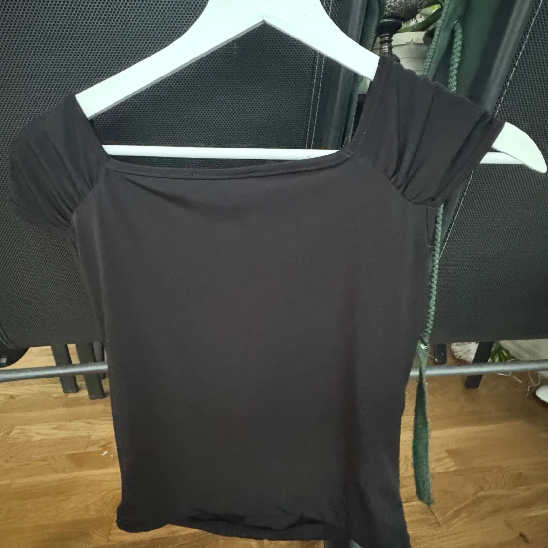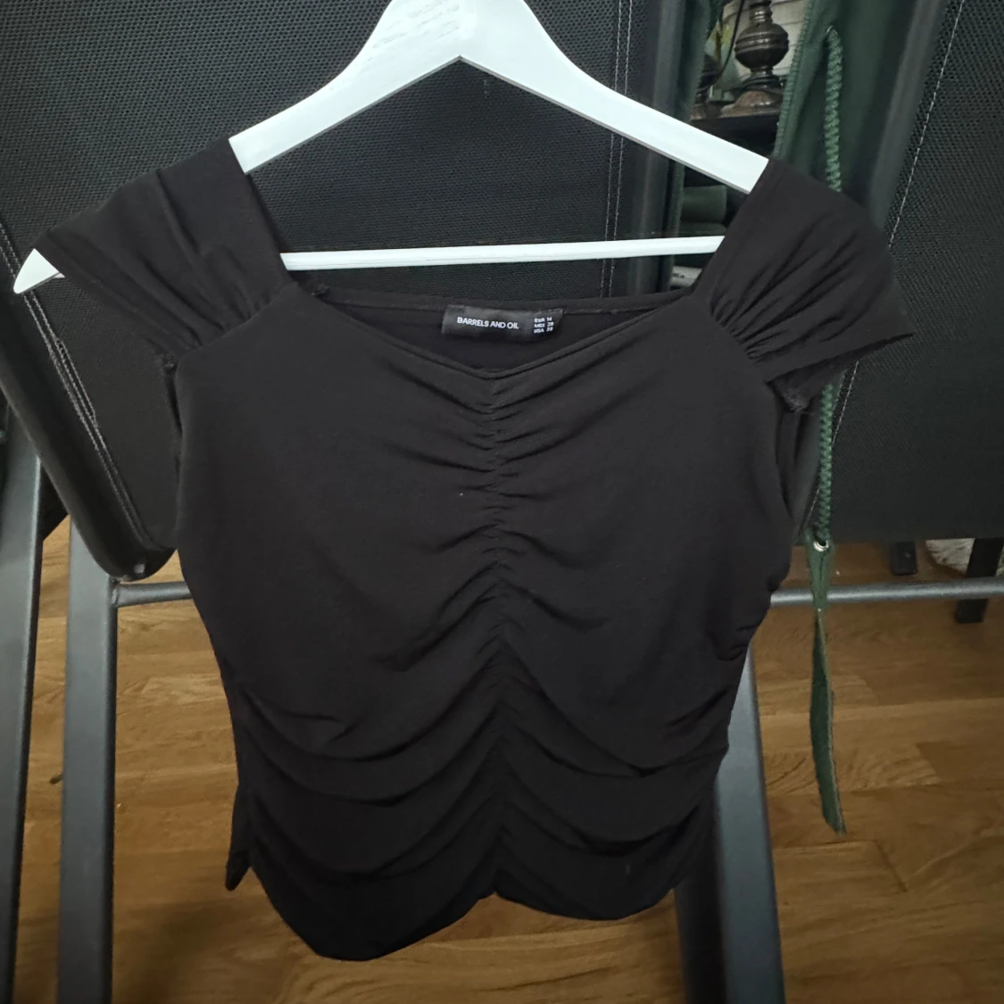 Säljer en svart topp från Barrel and Oil med snygg rynkad detalj framtill och lätt puffade axlar. Toppen är croppad och har en v-ringad halsringning. Perfekt att styla med jeans eller kjol för en trendig look.