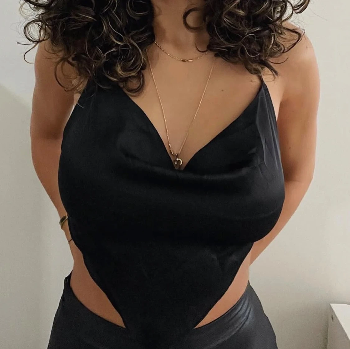 Snygg svart linnetopp i satin med draperad urringning och spetsig nederkant.