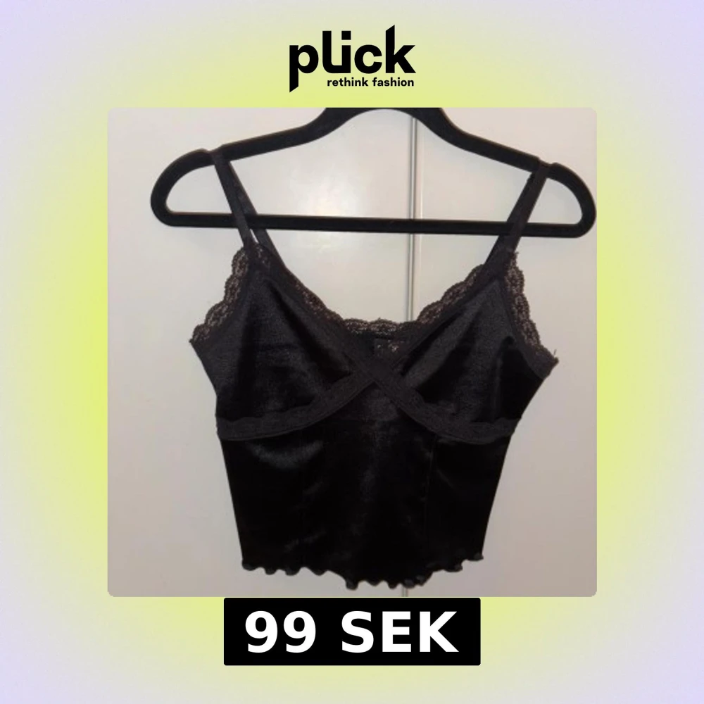 Supersnygg svart linnetopp från H&M Divided i satinliknande material med spetsdetaljer längs urringning och axelband. Croppad modell med vågig kant nertill och smala justerbara axelband. Perfekt att styla med jeans eller kjol för en trendig look.