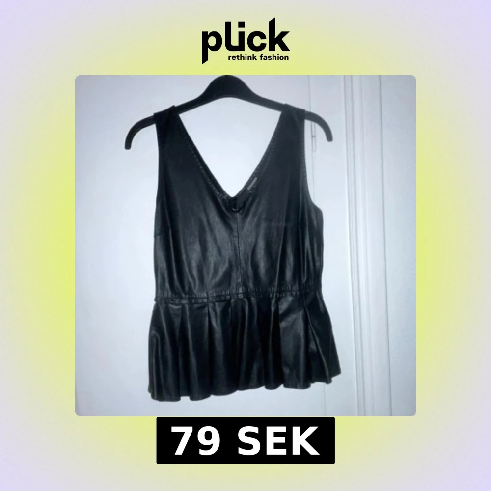 Snygg svart skinntopp med v-ringad design och volangdetaljer i nederkant. Perfekt för att ge en edgy touch till din outfit. Jättefint skick✨