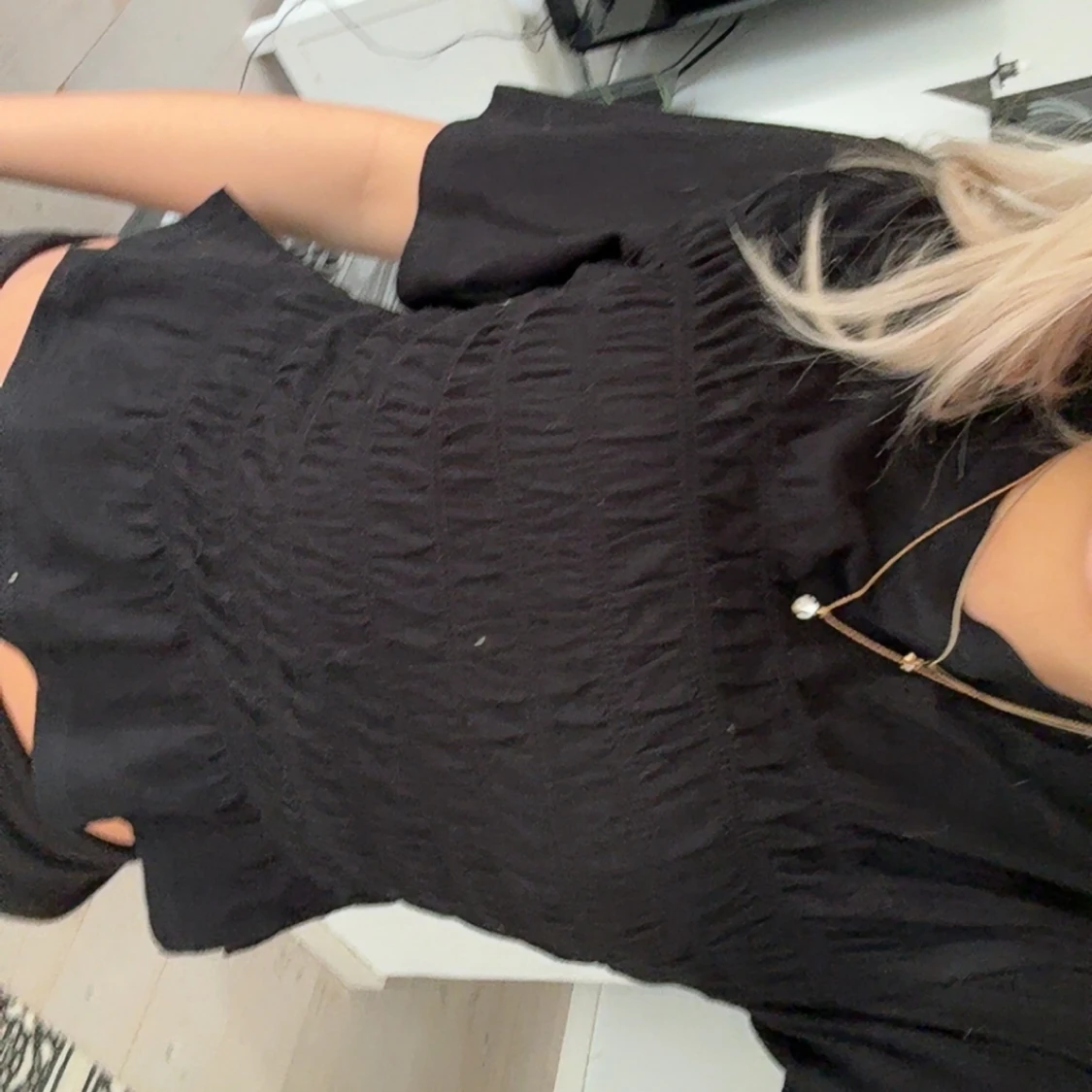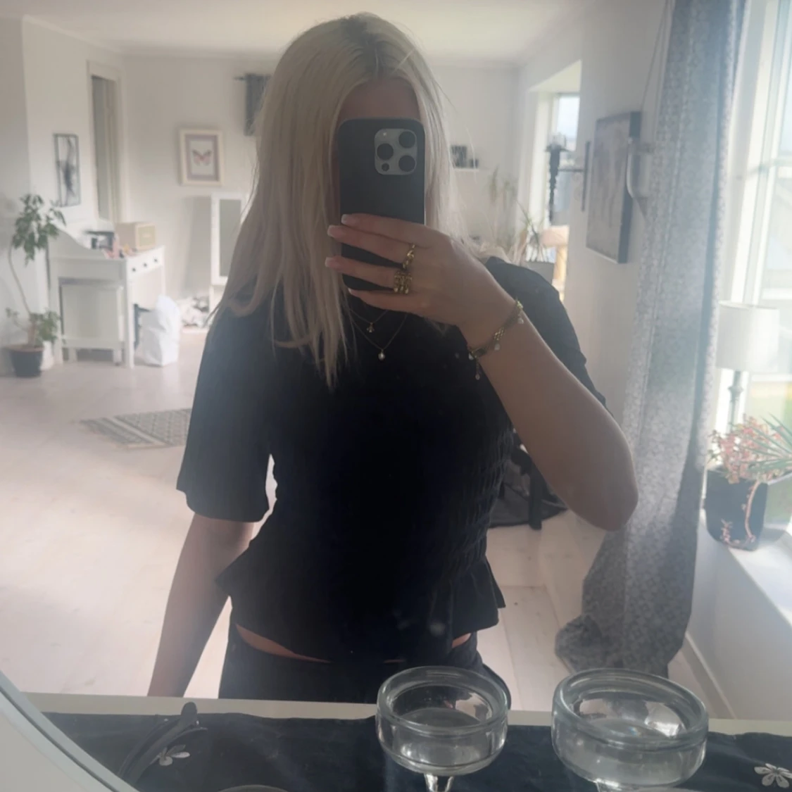 Säljer en svart blus med smockad midja och volang nedtill. Köpt på Gina Tricot, säljer då den inte kommer till användning🩷strlk s