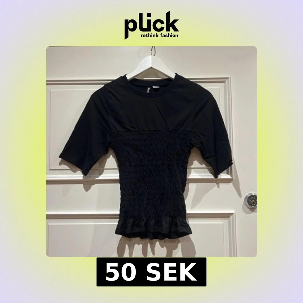 Svart topp från H&M Divided i storlek XS. Toppen har smockad midja och volangkant nertill, med korta ärmar och rund halsringning. Materialet är mjukt och stretchigt, perfekt för en trendig look.
