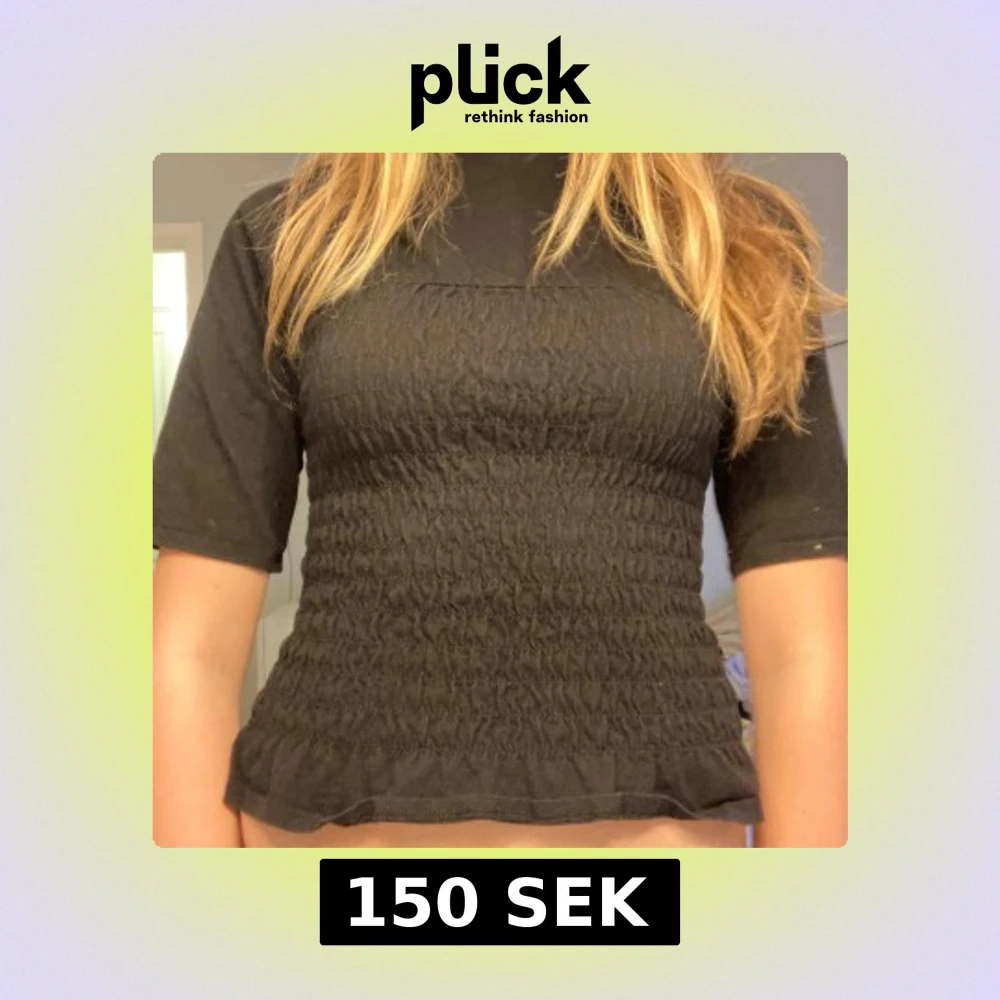 Svart topp med smockad midja och halvlånga ärmar. Toppen har en lätt volangkant nertill och en hög hals. Perfekt för en trendig och bekväm look.