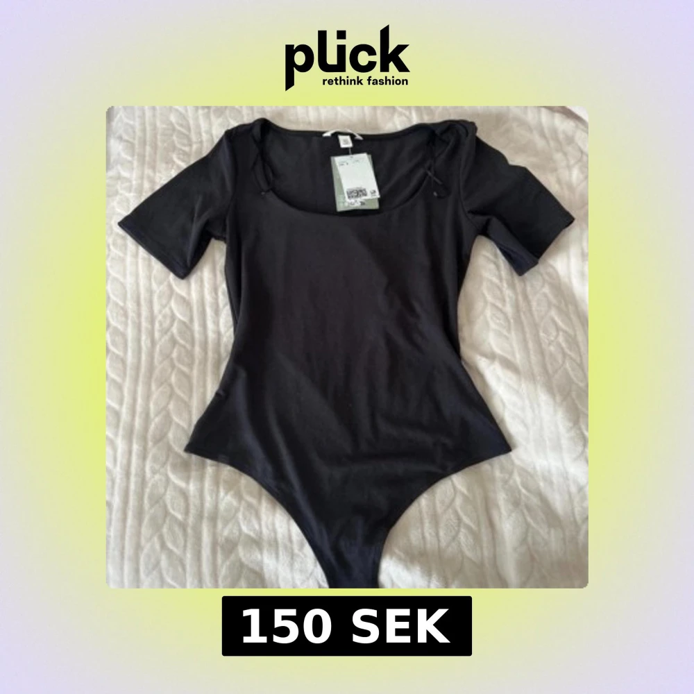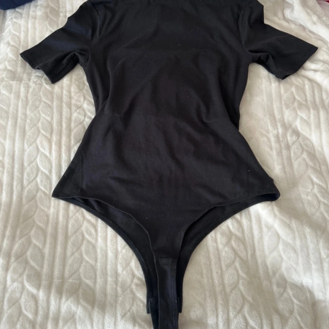 Svart snygg bodysuit från H&M med rundad halsringning och korta ärmar. Gjord i mjuk bomullsmix som sitter tight och smickrande. Perfekt att styla med jeans eller kjol för en clean look.