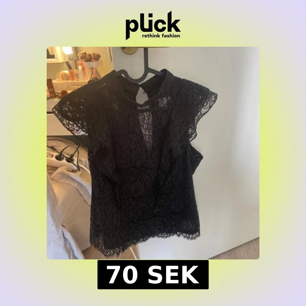 Säljer en svart blus i spets med v-ringning och korta ärmar. Blusen har fina spetsdetaljer och är perfekt för att lyfta en outfit. Lätt och luftig modell.