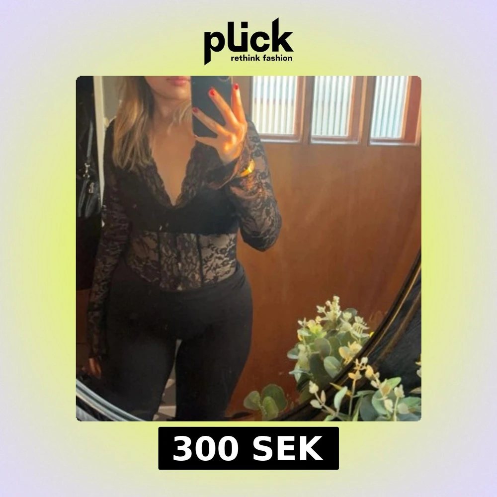 Säljer en elegant svart spetsblus med långa ärmar och djup v-ringning. Perfekt för en stilfull look.