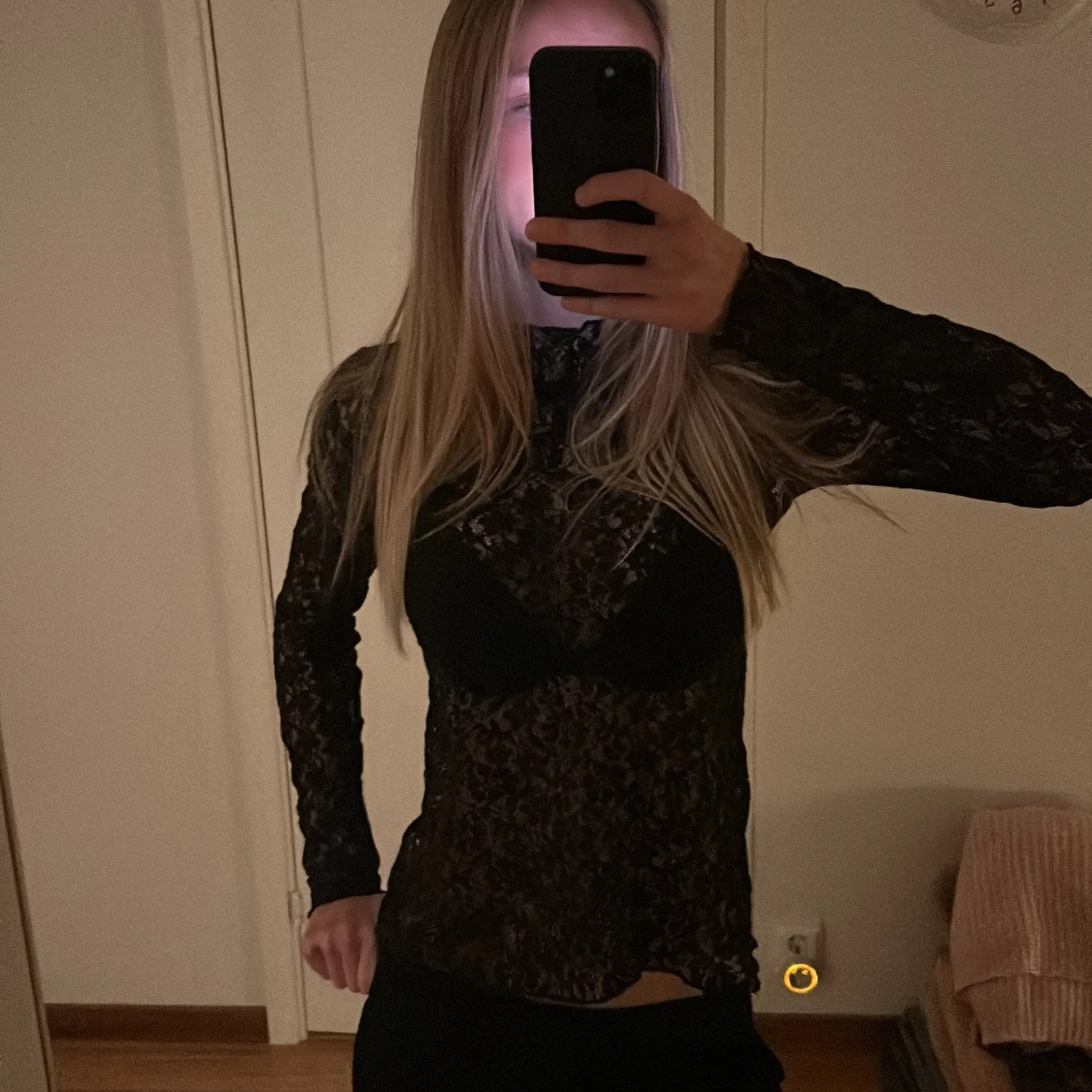 Säljer en elegant svart spetsblus med långärmad design. Perfekt för en utekväll eller fest. Blusen har en tight passform och är tillverkad i ett vackert spetsmaterial som ger en sofistikerad look.