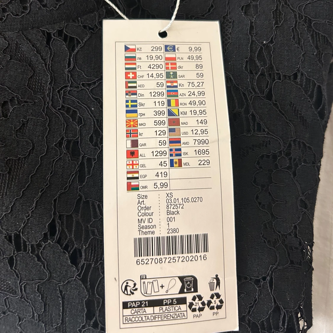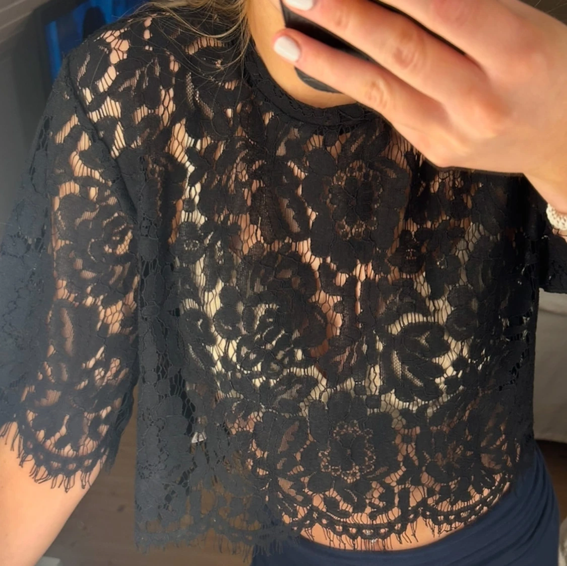 Säljer en elegant svart spetsblus från Amisu i storlek XS. Blusen har ett vackert blommönster och trekvartsärmar. Perfekt för en stilfull look.