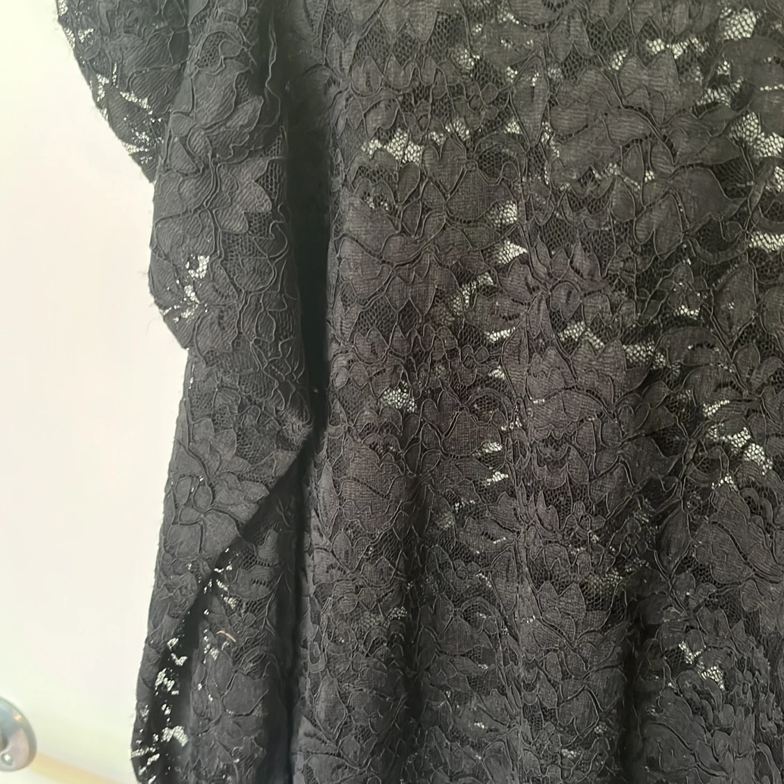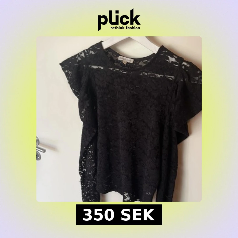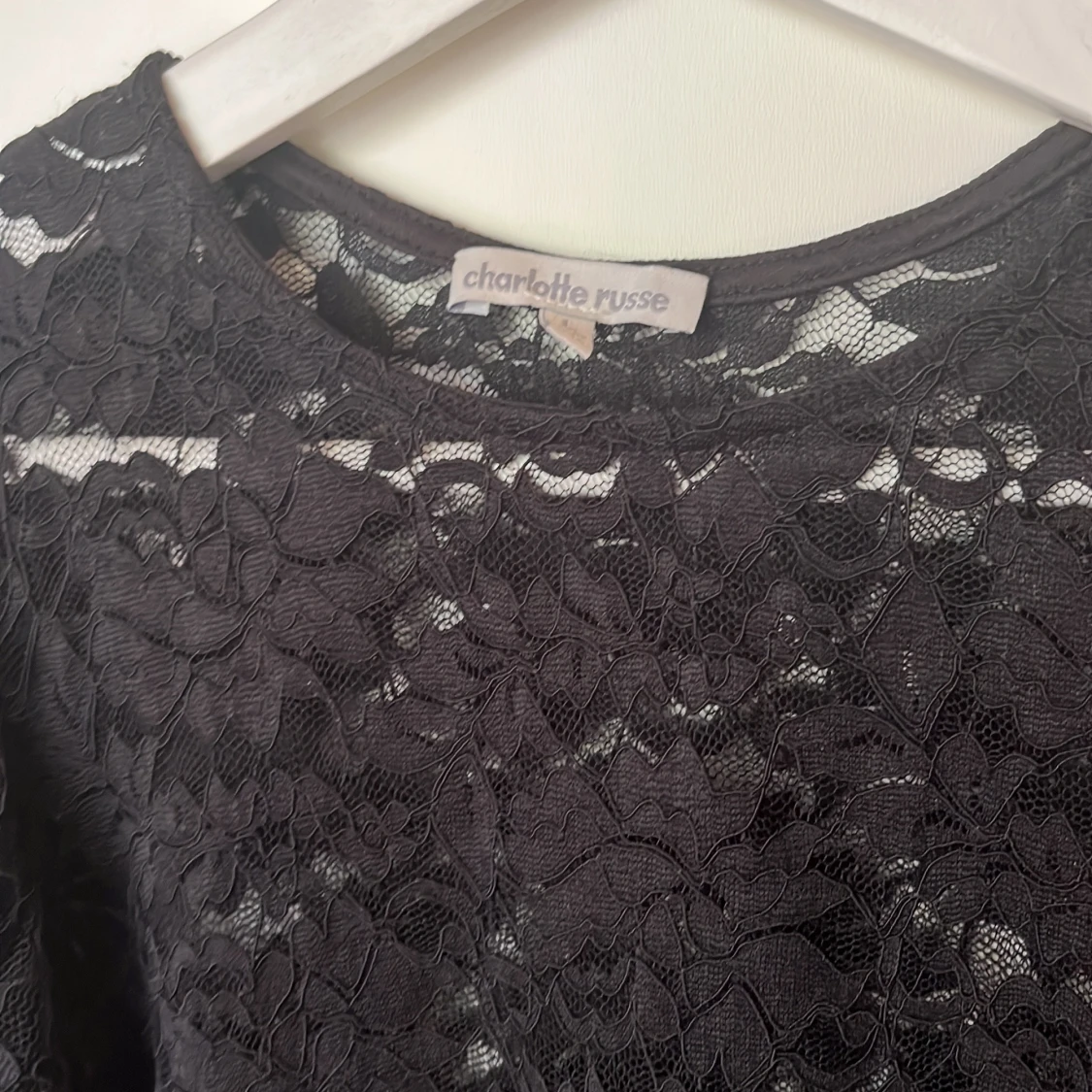 Säljer en svart blus från Charlotte Russe som är köpt för 500 kroner i usa. Vacker spets med blommönster. Blusen har korta ärmar och rund halsringning. Perfekt för dig som vill ha en elegant och stilren topp med fina detaljer.