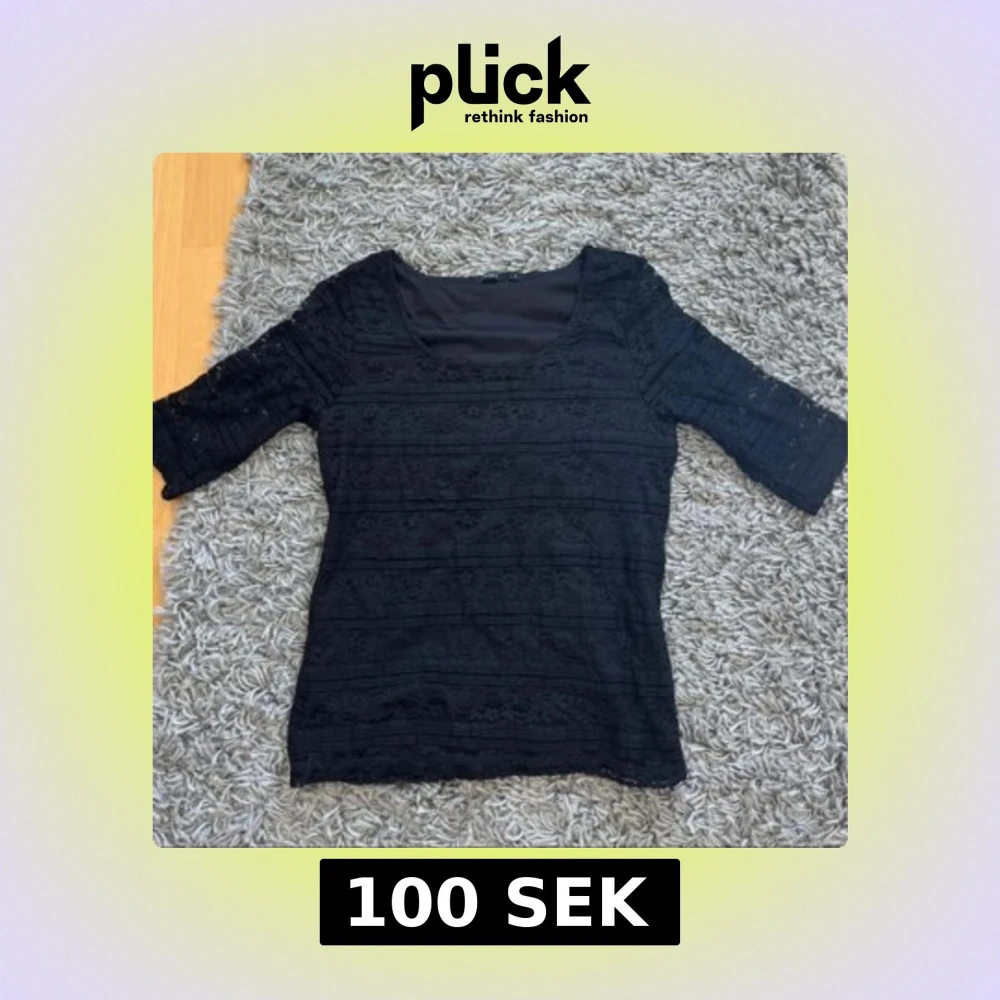 Svart blus från Lindex i storlek S med halvtransparent spets och rund halsringning. Blusen har trekvartsärm och ett fodrat liv, vilket ger en snygg kontrast mellan spetsmönstret och det täckta tyget. Perfekt för dig som gillar detaljer och stilren look.