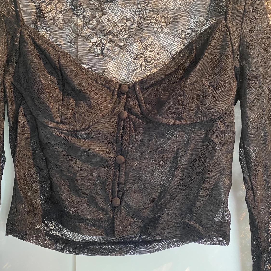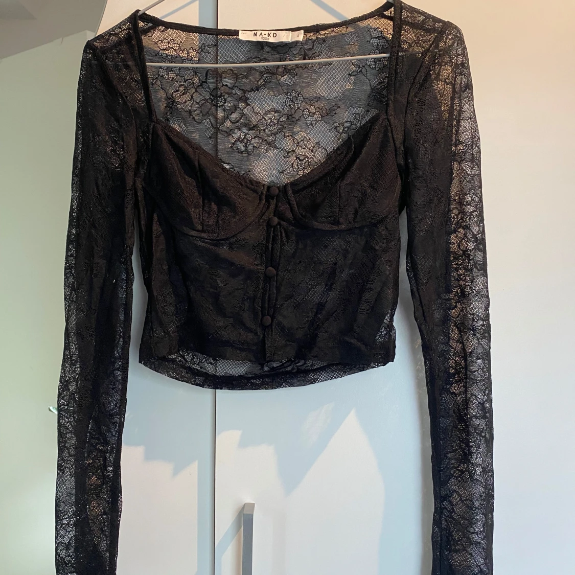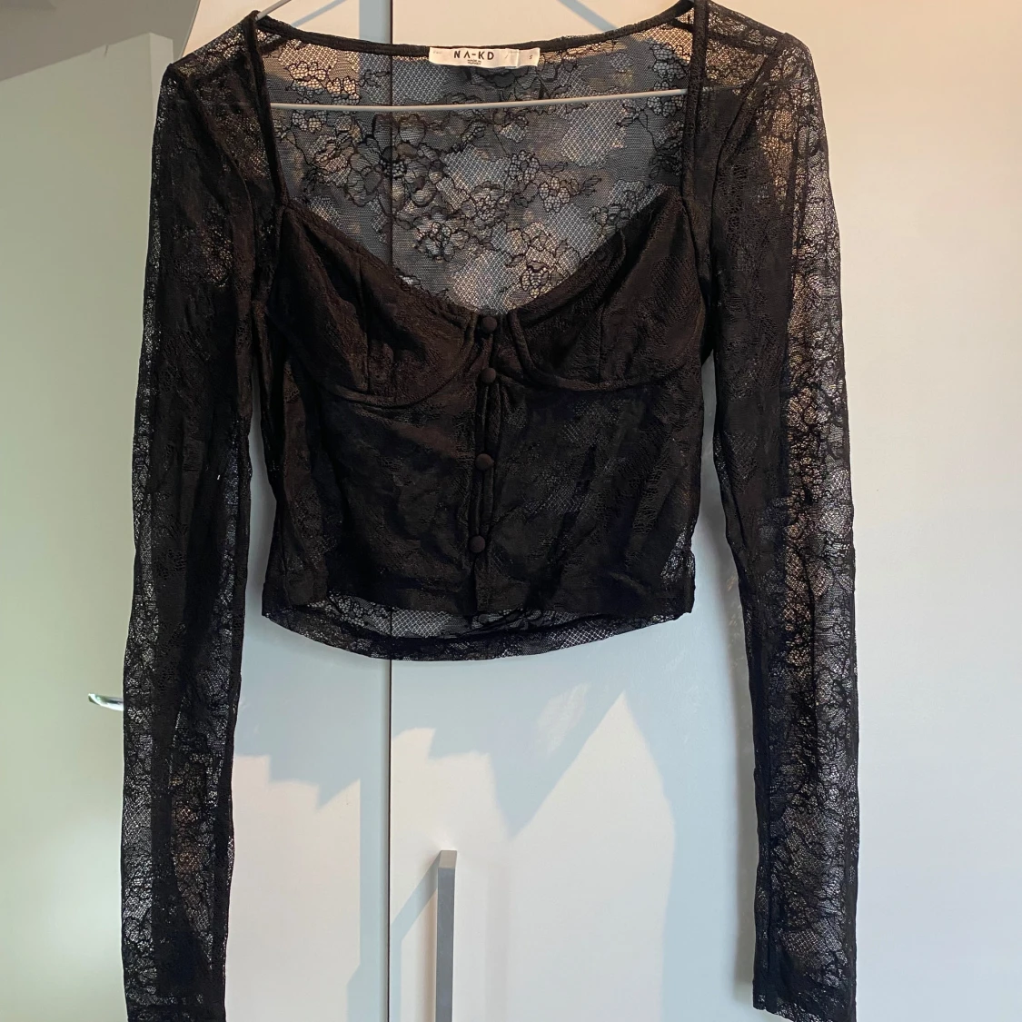 Säljer en supersnygg helt oanvänd svart topp från NA-KD i transparent spets med blommigt mönster som tyvärr är för liten för mig! . Den har knappar framtill och croppad passform. Perfekt för dig som vill ha en trendig och snygg look.