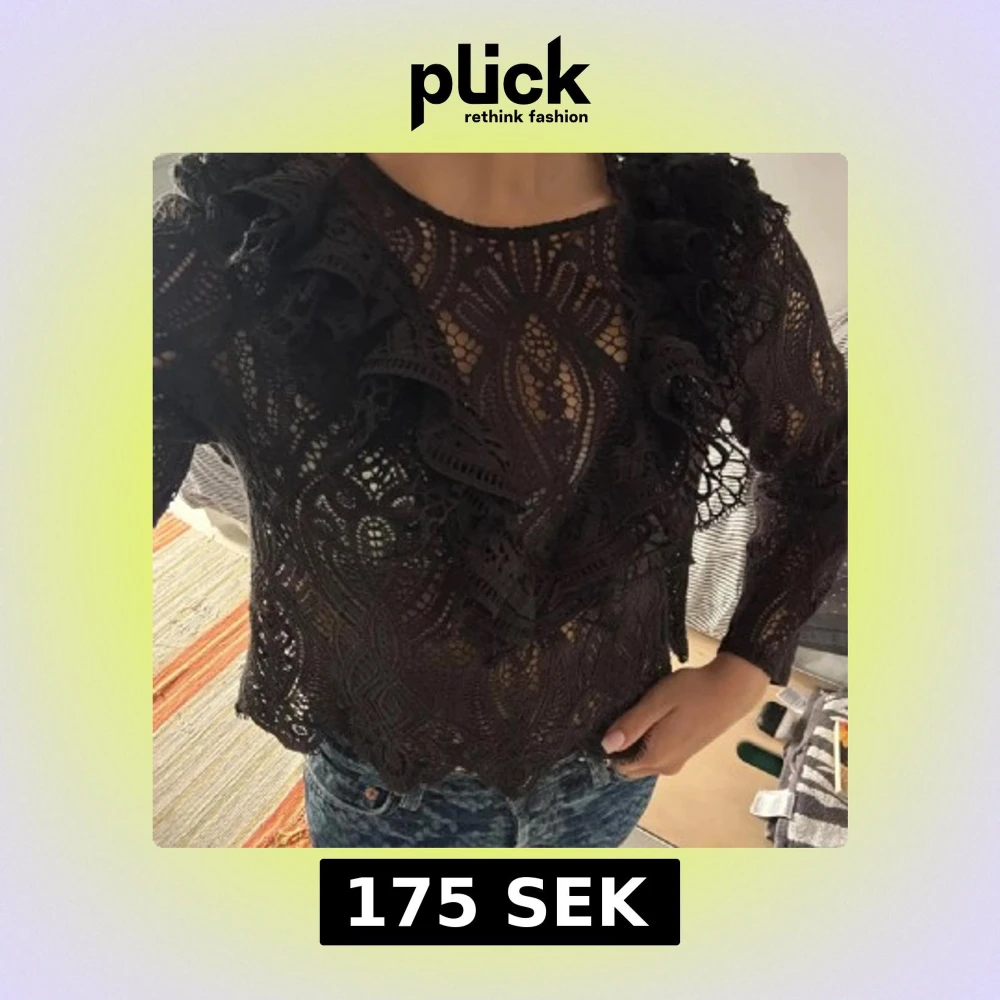 Svart blus i spets med vackra broderade detaljer och volanger framtill. Blusen har lång ärm och rund halsringning. Perfekt för dig som gillar romantisk och trendig stil.