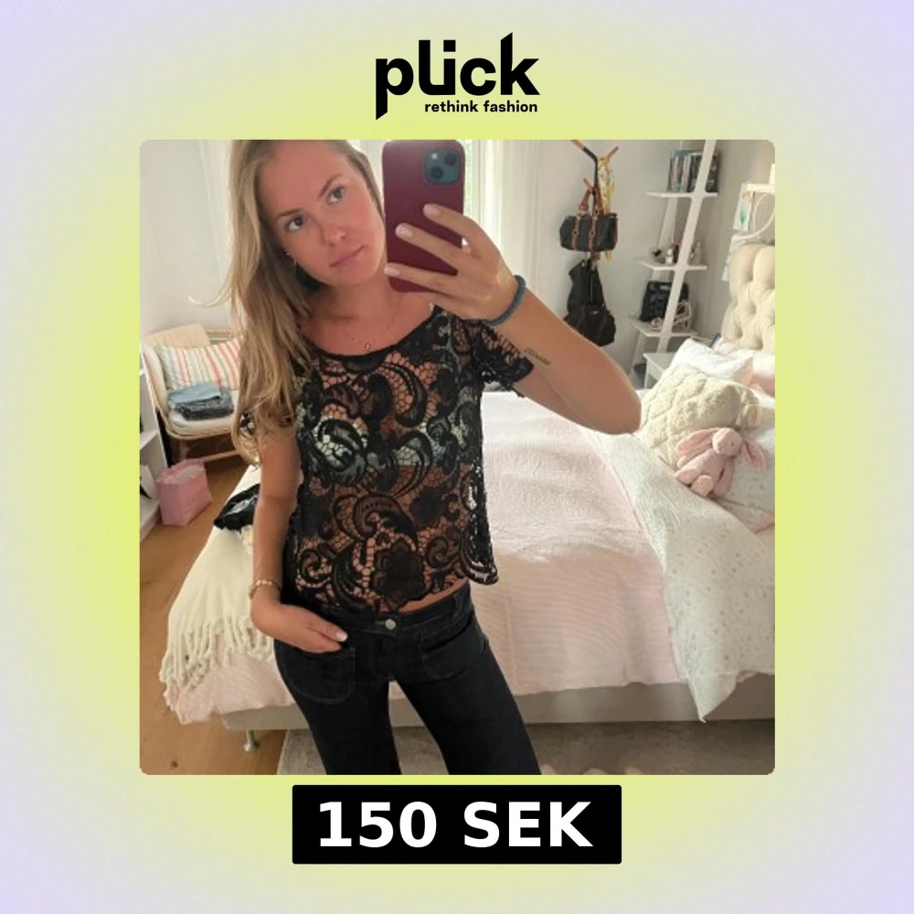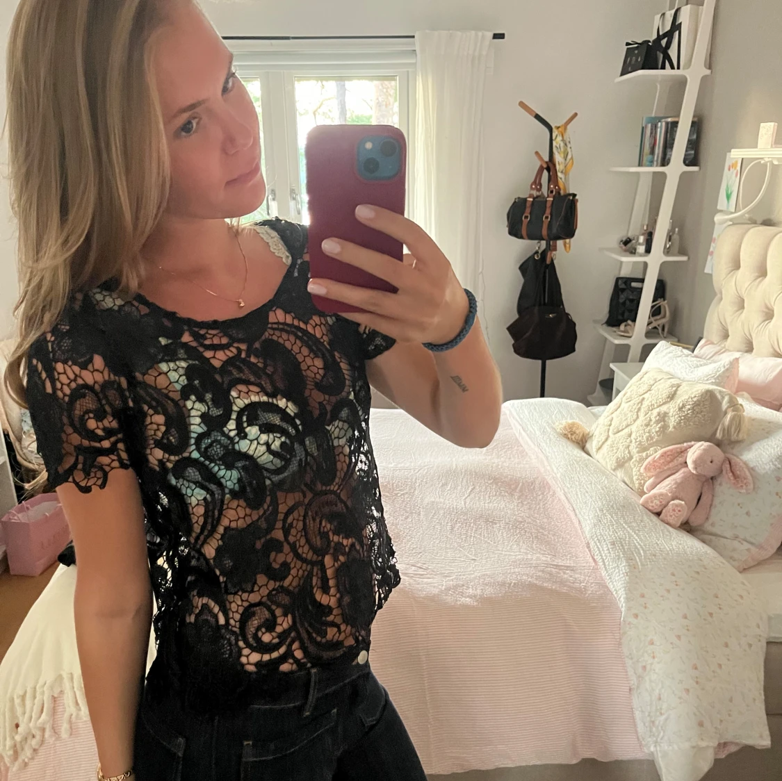 Säljer en svart blus i genombruten spets med snyggt virkat mönster. Modellen är croppad och har korta ärmar samt rund halsringning. Perfekt att styla med jeans eller kjol för en cool look.