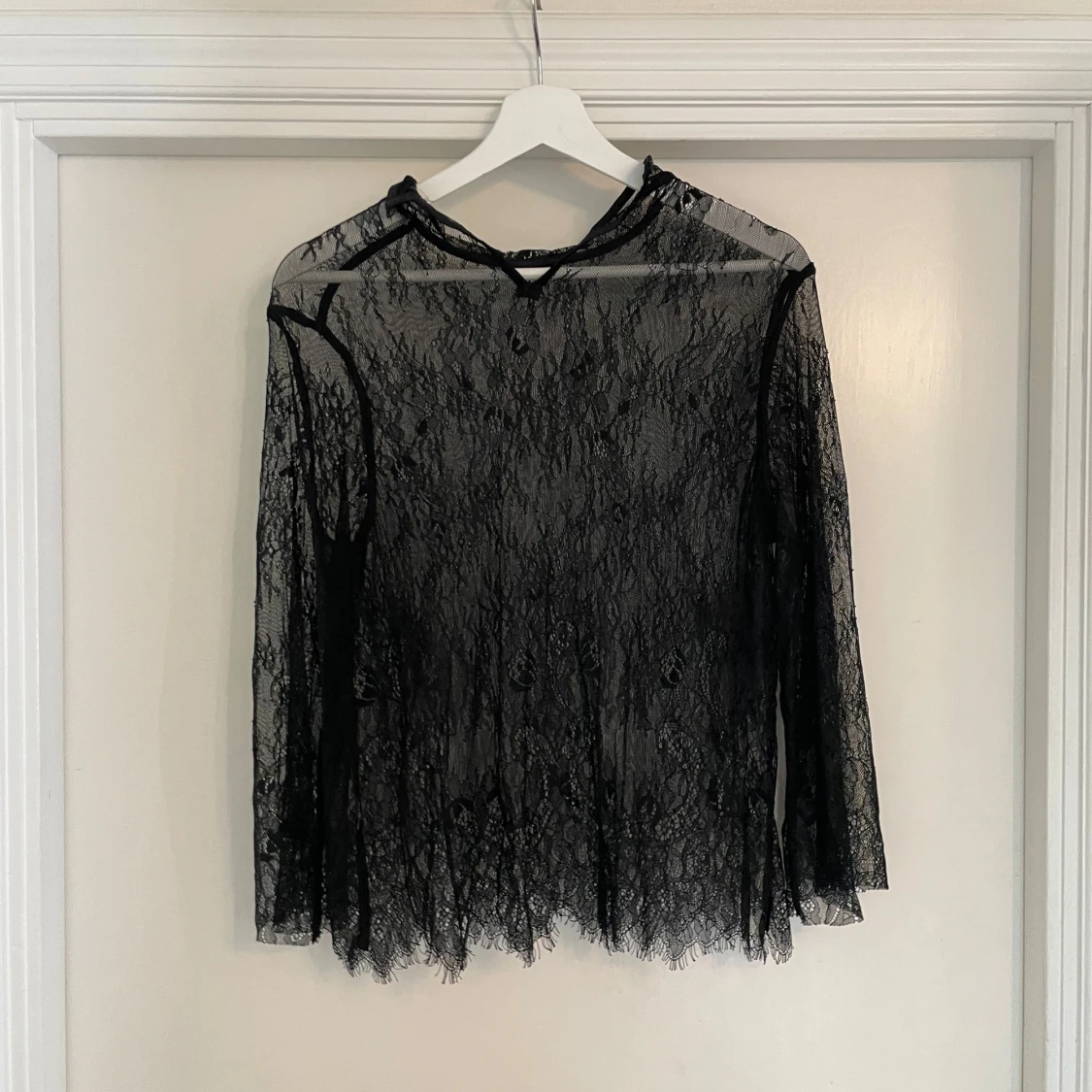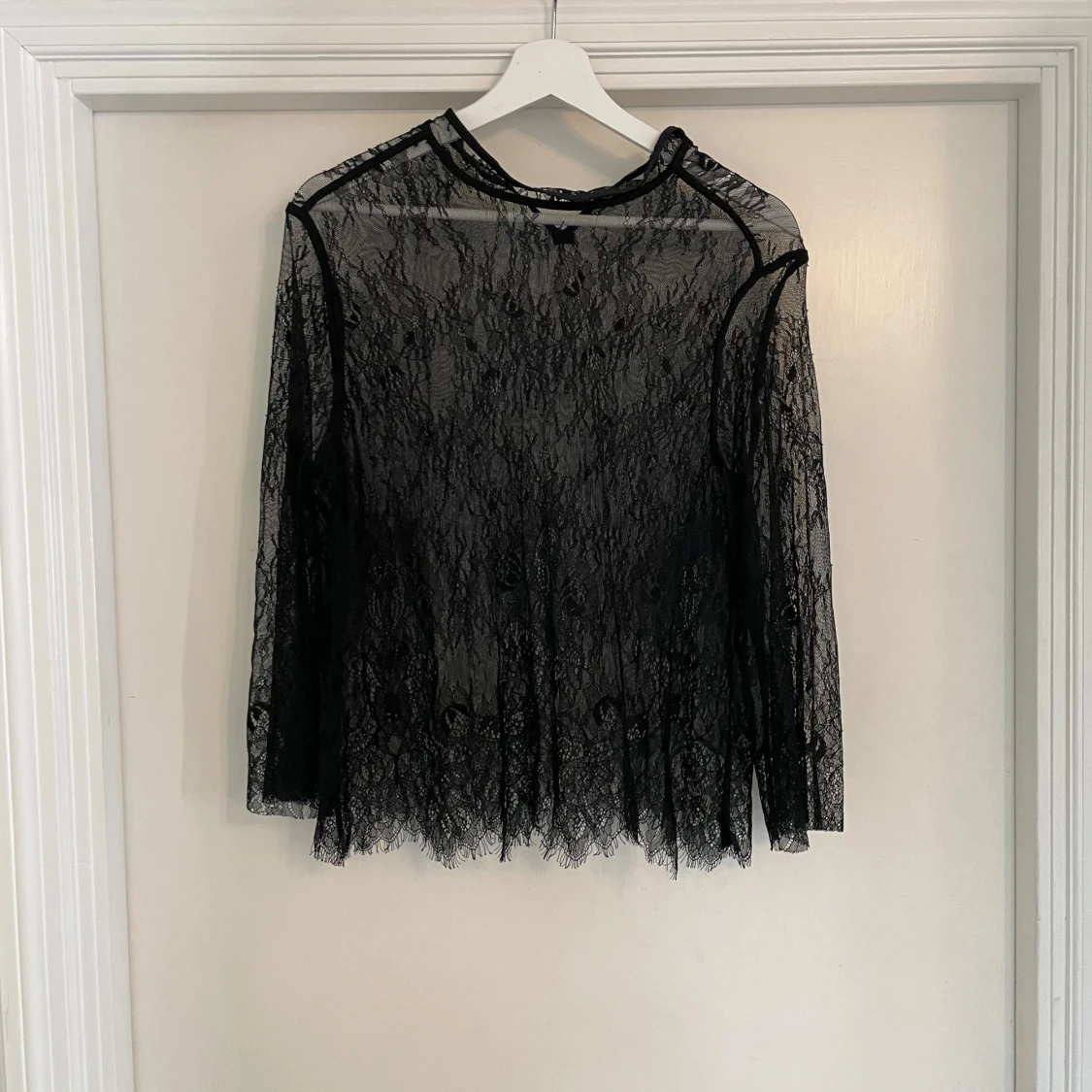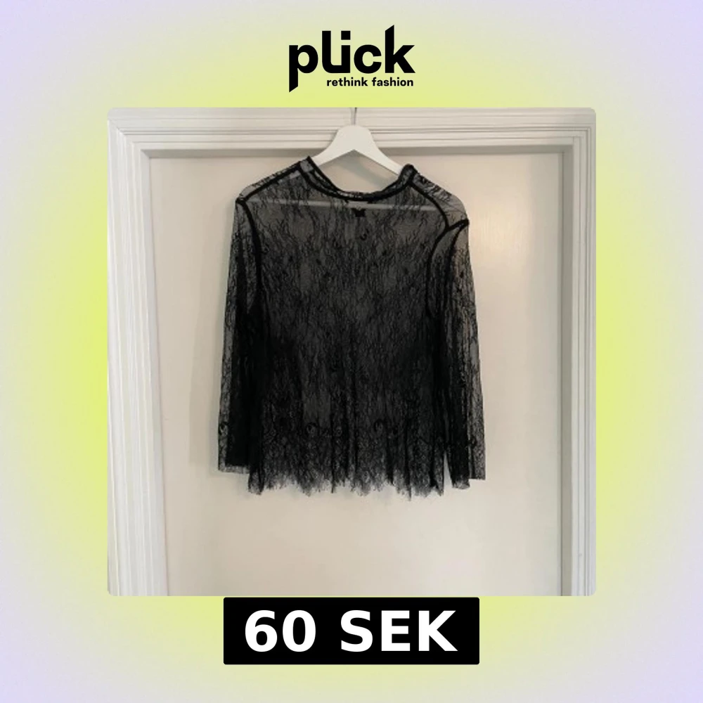 Säljer en transparent svart blus i spets med lång ärm. Blusen har en rund halsringning och fina spetsdetaljer över hela plagget. Perfekt för dig som vill ha en edgy och trendig look med lite extra attityd.