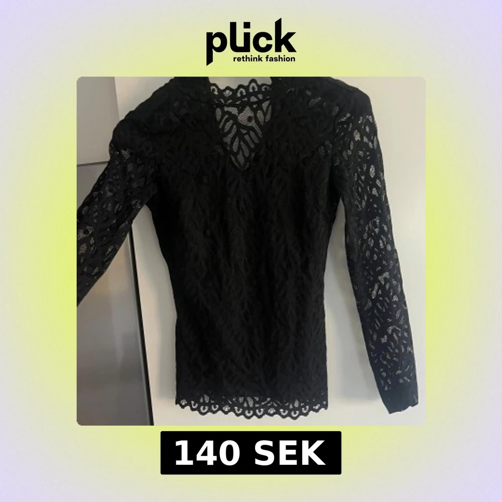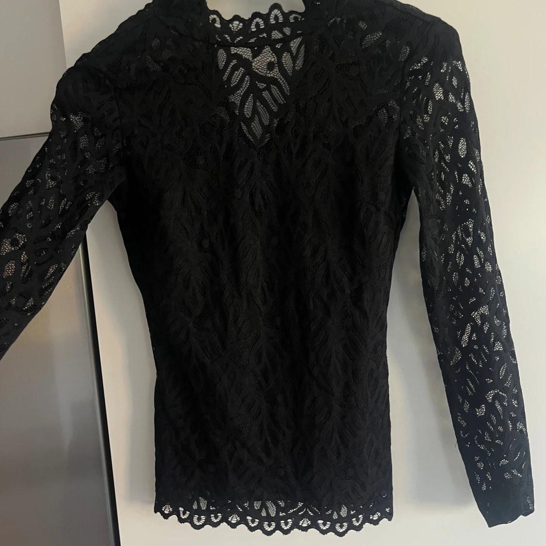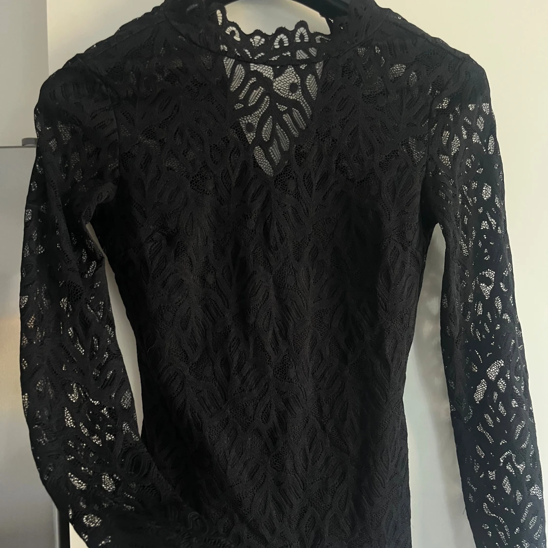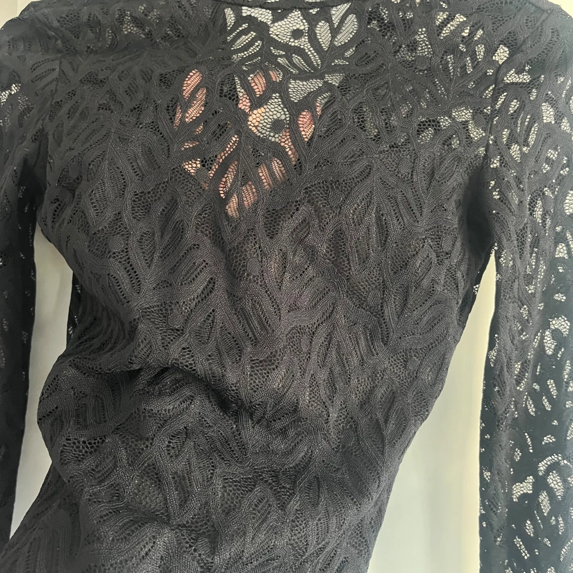 Säljer en svart blus i spets med lång ärm och snyggt mönstrad, transparent design. Blusen har ett bladliknande spetsmönster och en v-ringad detalj vid halsen. Perfekt för dig som gillar att sticka ut med coola detaljer och elegant stil.