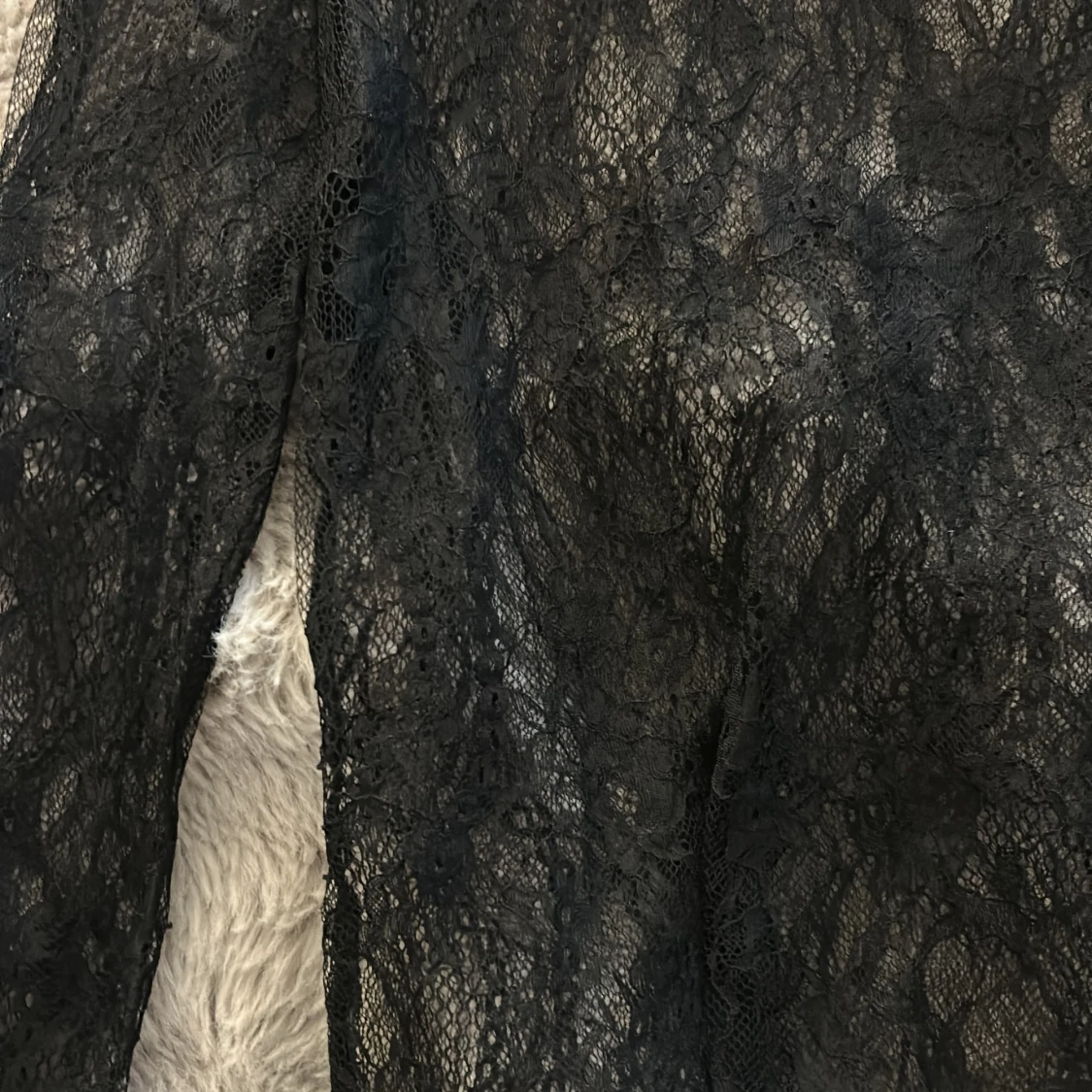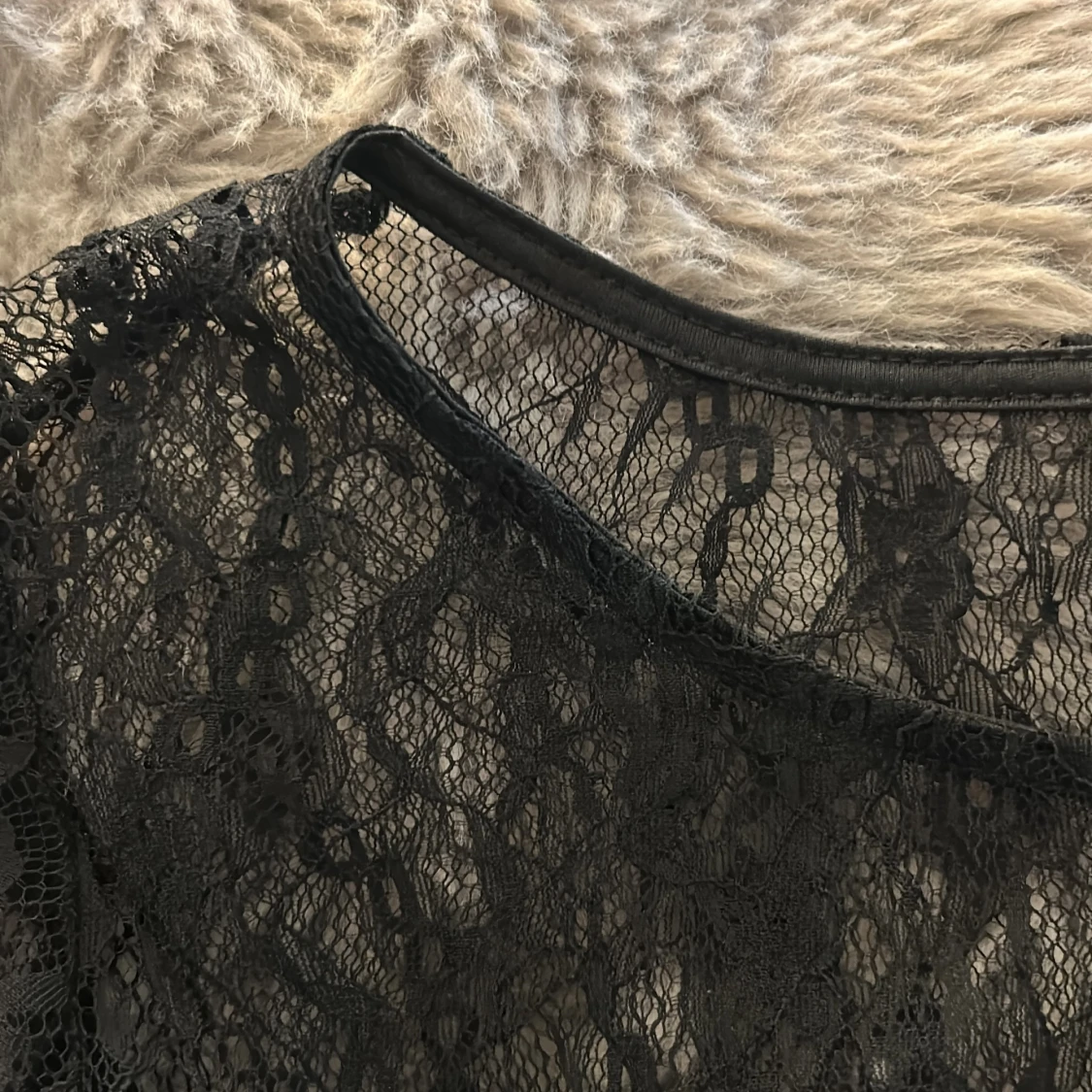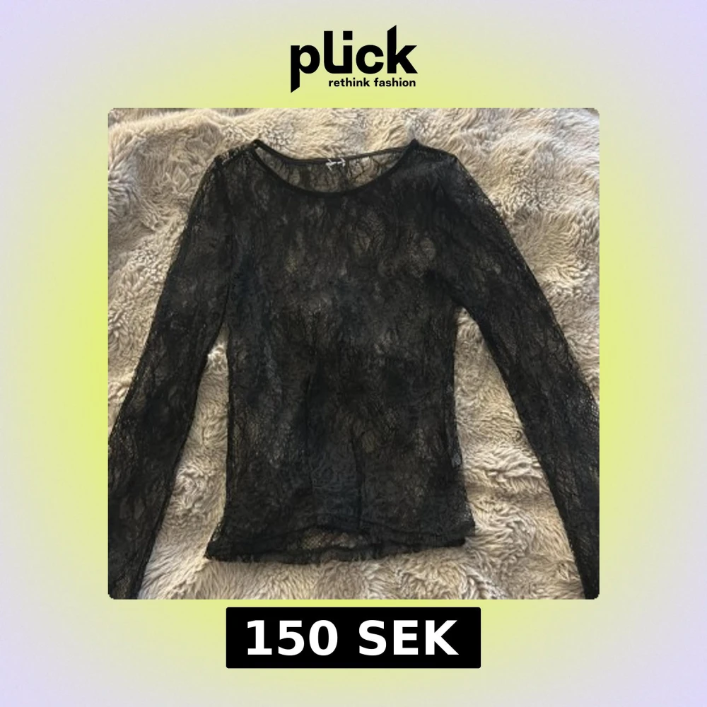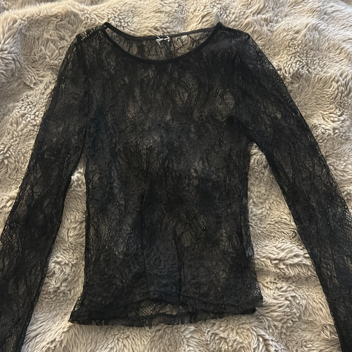 Säljer en svart, transparent spetsblus med lång ärm från Nelly. Blusen har rund halsringning och är gjord i ett tunt, detaljerat spetsmaterial som ger en cool och edgy vibe. Perfekt att styla lager på lager eller med ett linne under för extra effekt.