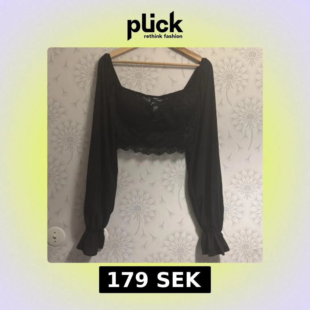 Snygg svart blus med spetsdetaljer och långa ärmar. Blusen har en croppad design och elastiska ärmslut. Perfekt för en stilren look.