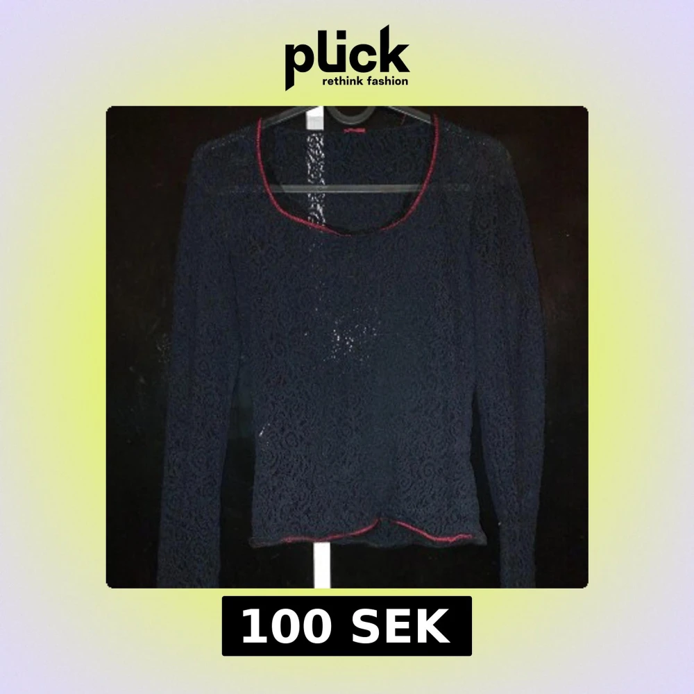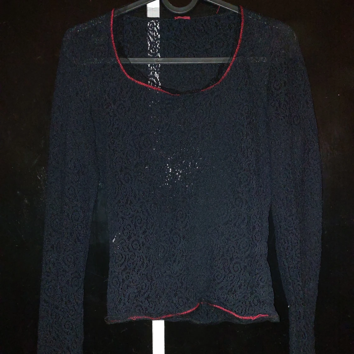 Så snygg svart blus med röda sömmar o en liten krage i spets, delvis transparent pga mönstret