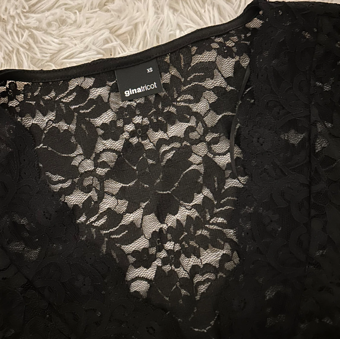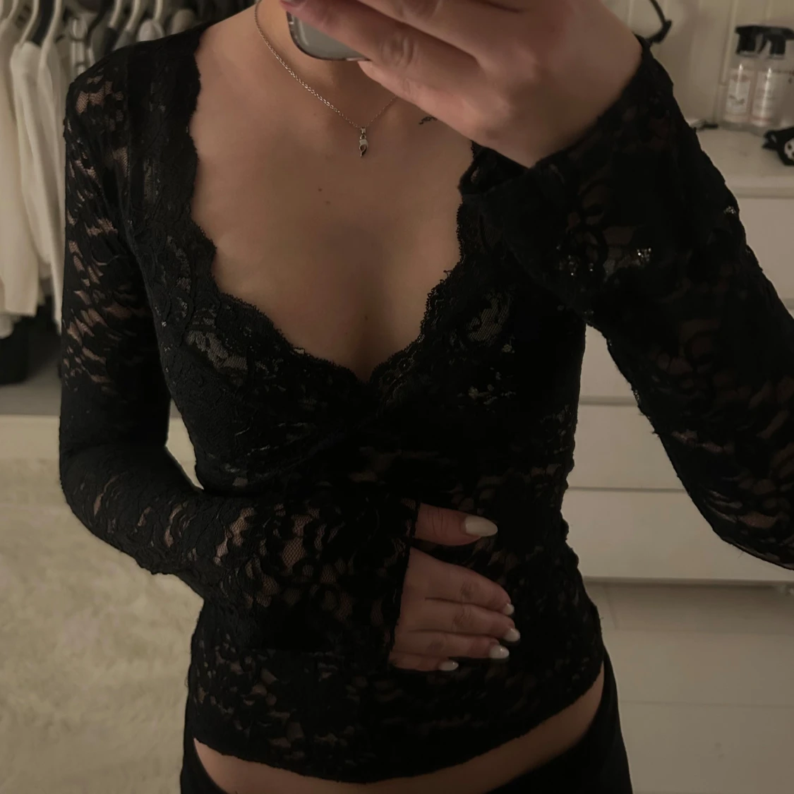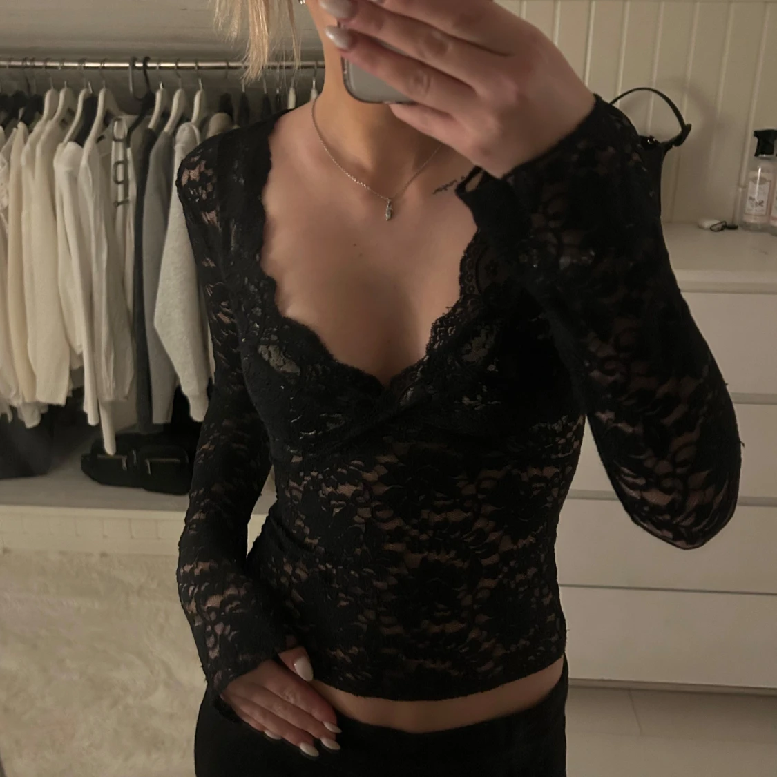 Säljer en svart långärmad blus i spets med djup v-ringning och figurnära passform. Blusen har transparent spetsmaterial och fina spetsdetaljer längs urringningen. Perfekt för dig som vill ha en snygg och trendig topp med lite edge. Använd fåtal gånger men inget som syns, storlek: xs. Inga fläckar eller hål!🤍pris:200kr