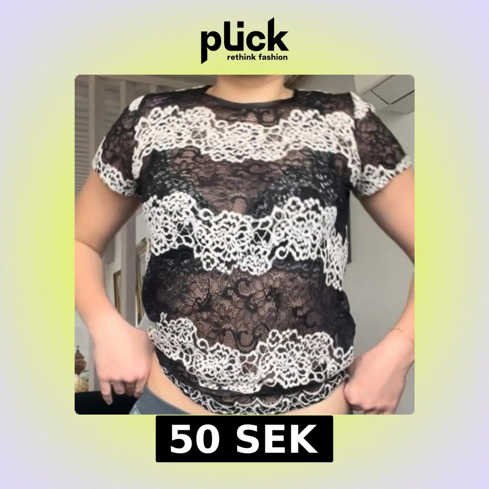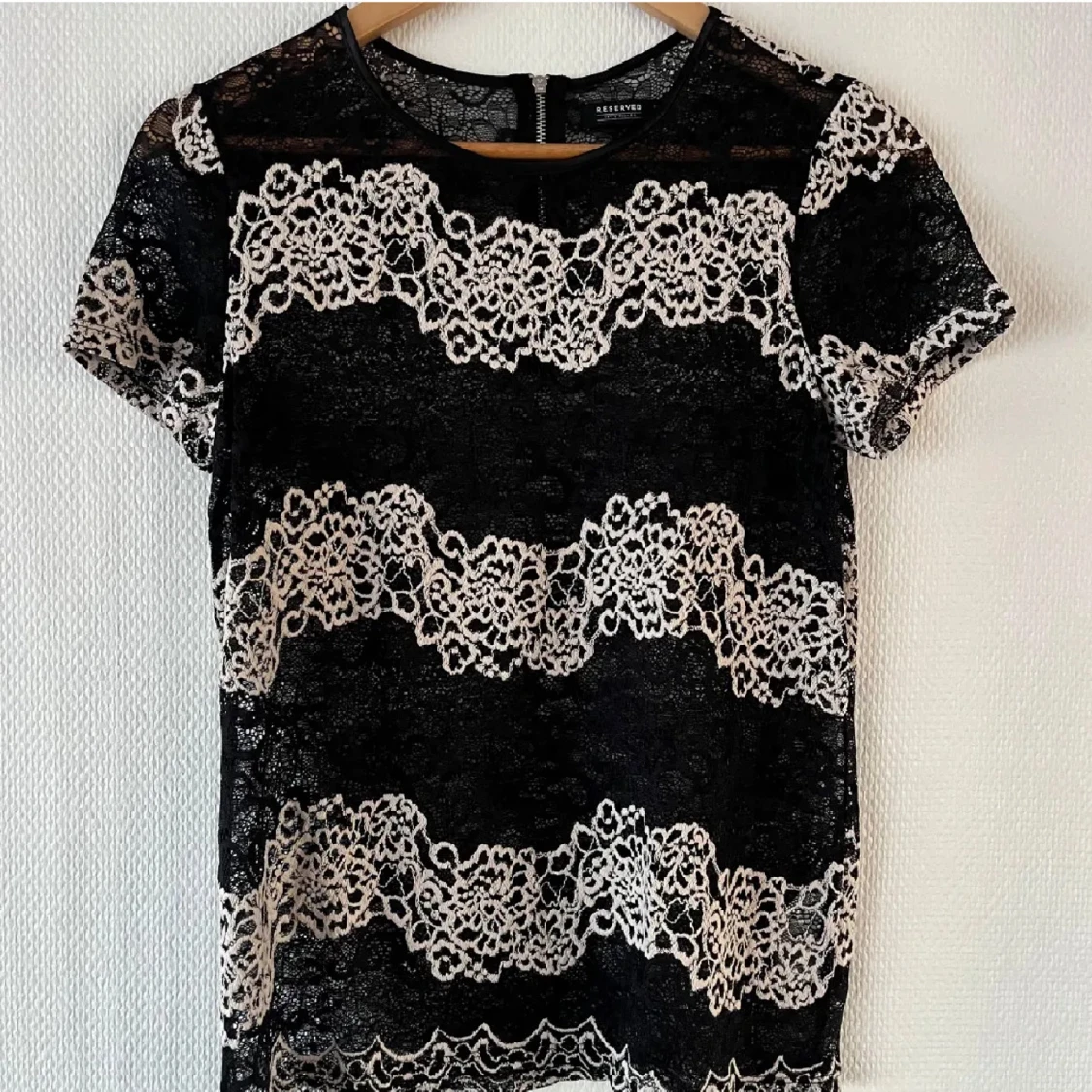 Supersnygg svart blus med korta ärmar och transparent spets. Blusen har breda vågiga ränder i vit spets som ger en cool kontrast. Liknar Intimissimis ikoniska spets. Rund halsringning och figurnära passform🖤
