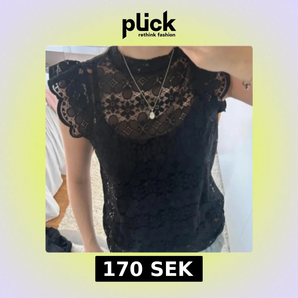 Supersnygg svart blus i spets med blommigt mönster och volangdetaljer vid axlarna. Hög hals och ärmlös design ger en chic vibe. Perfekt att styla med jeans eller kjol för en trendig look.