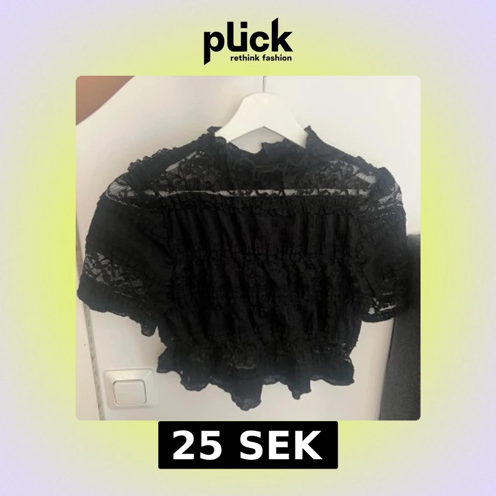 Supersöt svart blus i spets med volangdetaljer och hög hals. Blusen är kortare i modellen och har korta ärmar. Perfekt för dig som gillar romantisk och trendig stil.