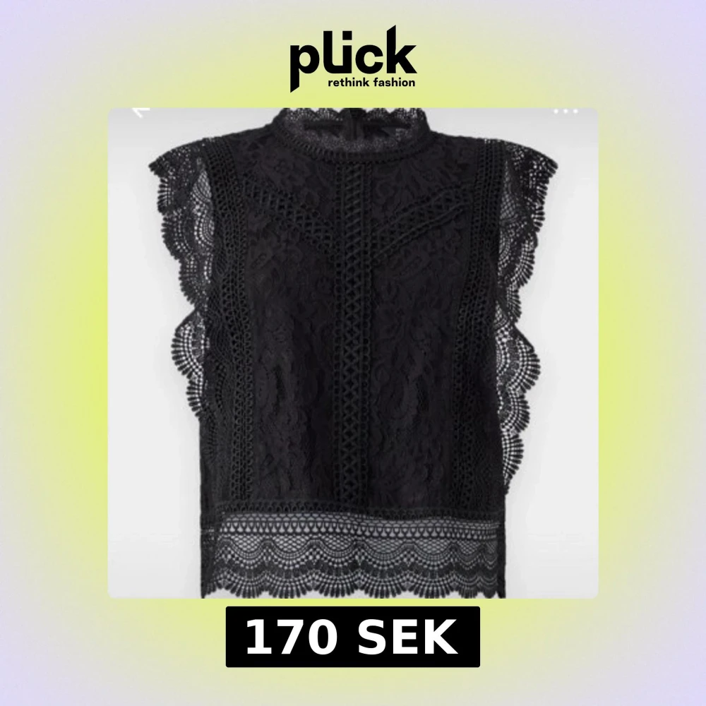 Elegant svart spetsblus med detaljerade spetskanter och ett vackert blommönster. Blusen är ärmlös och har en hög halsringning, vilket ger en sofistikerad look. Perfekt för en stilfull kväll.