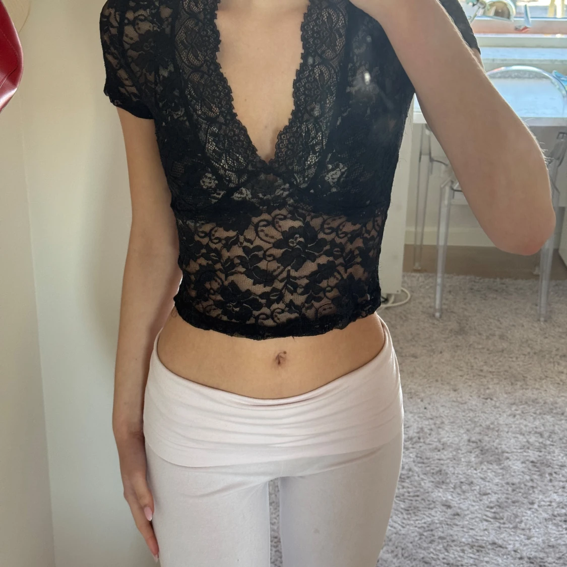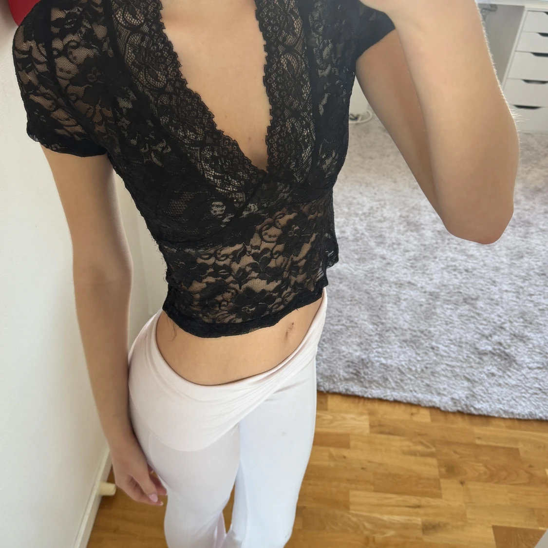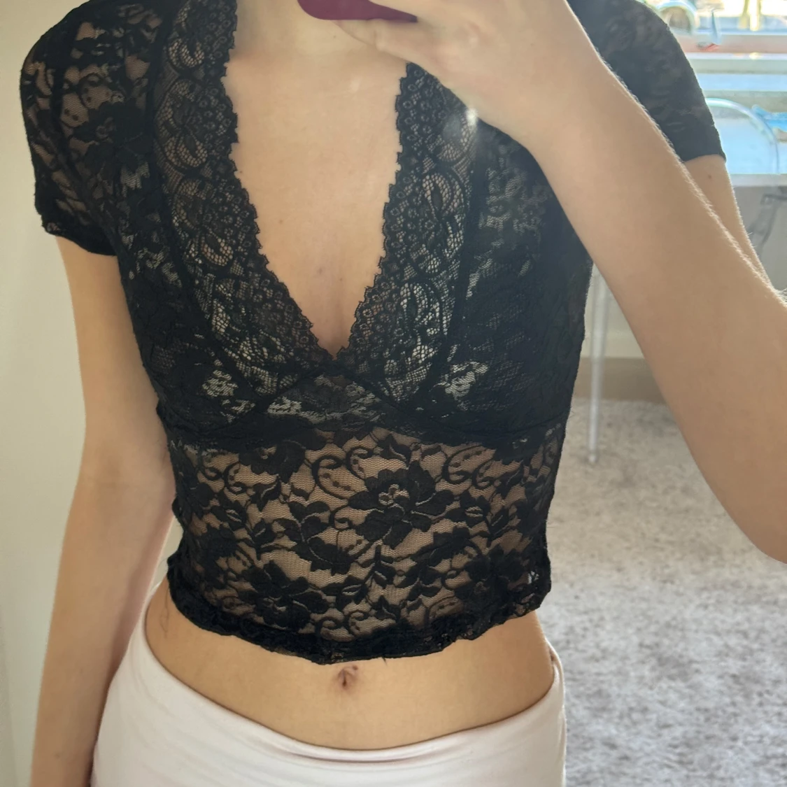 Säljer en elegant svart spetsblus med korta ärmar och djup v-ringning. Blusen är croppad och har ett vackert blommigt mönster i spetsen. Perfekt för en stilfull look. Helt ny