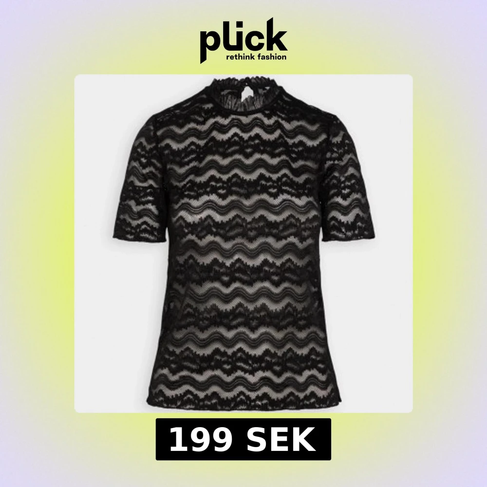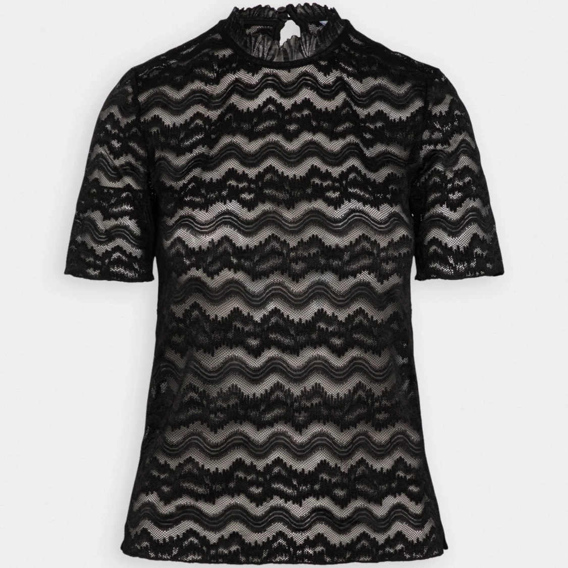 Elegant svart spetsblus med korta ärmar och vågigt mönster. Perfekt för en stilfull look! Köpt för 329kr på Zalando, tröjan är aldrig använd och har lappen kvar!