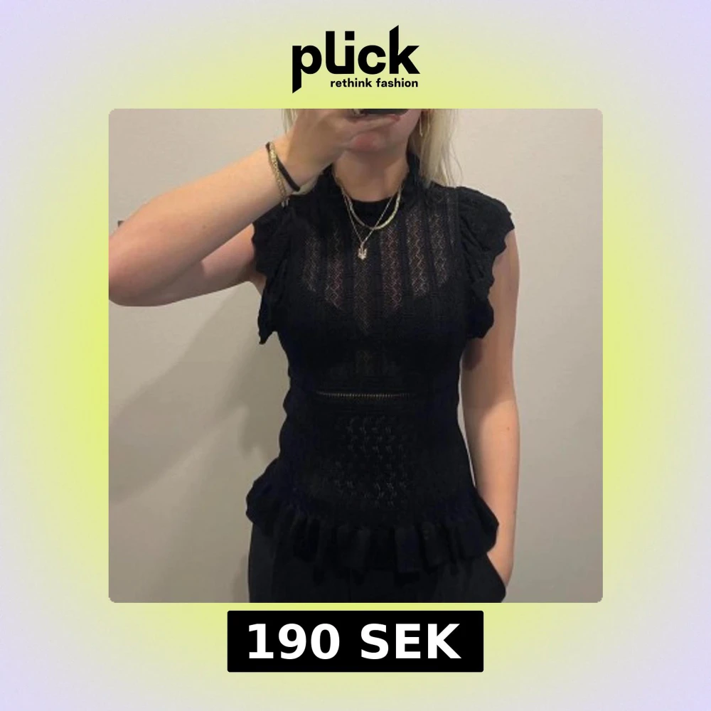 Svart spetsblus från Zara med volangdetaljer vid ärmar och nederkant, kortärmad med en hög halsringning. Passar xs-s.