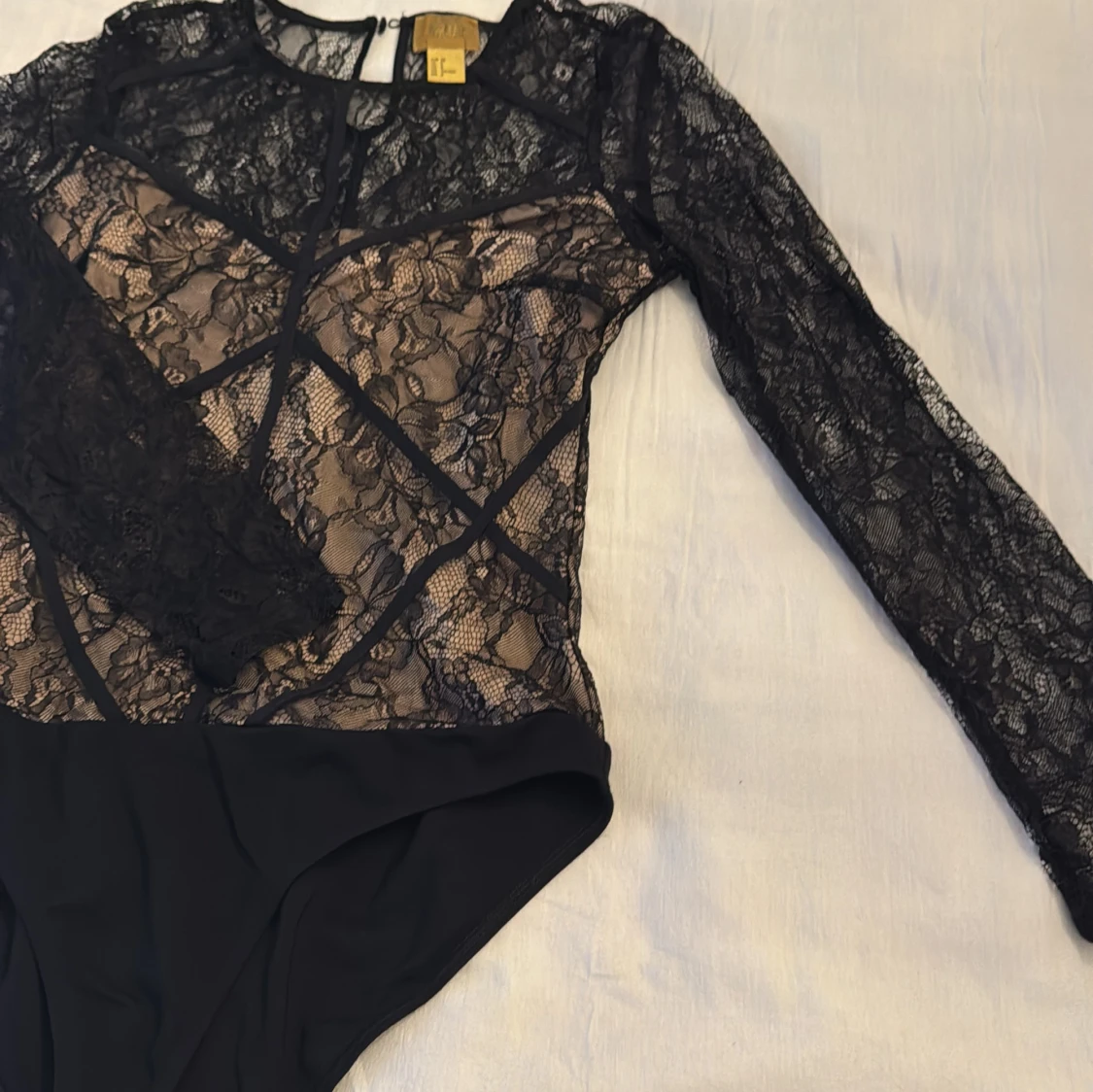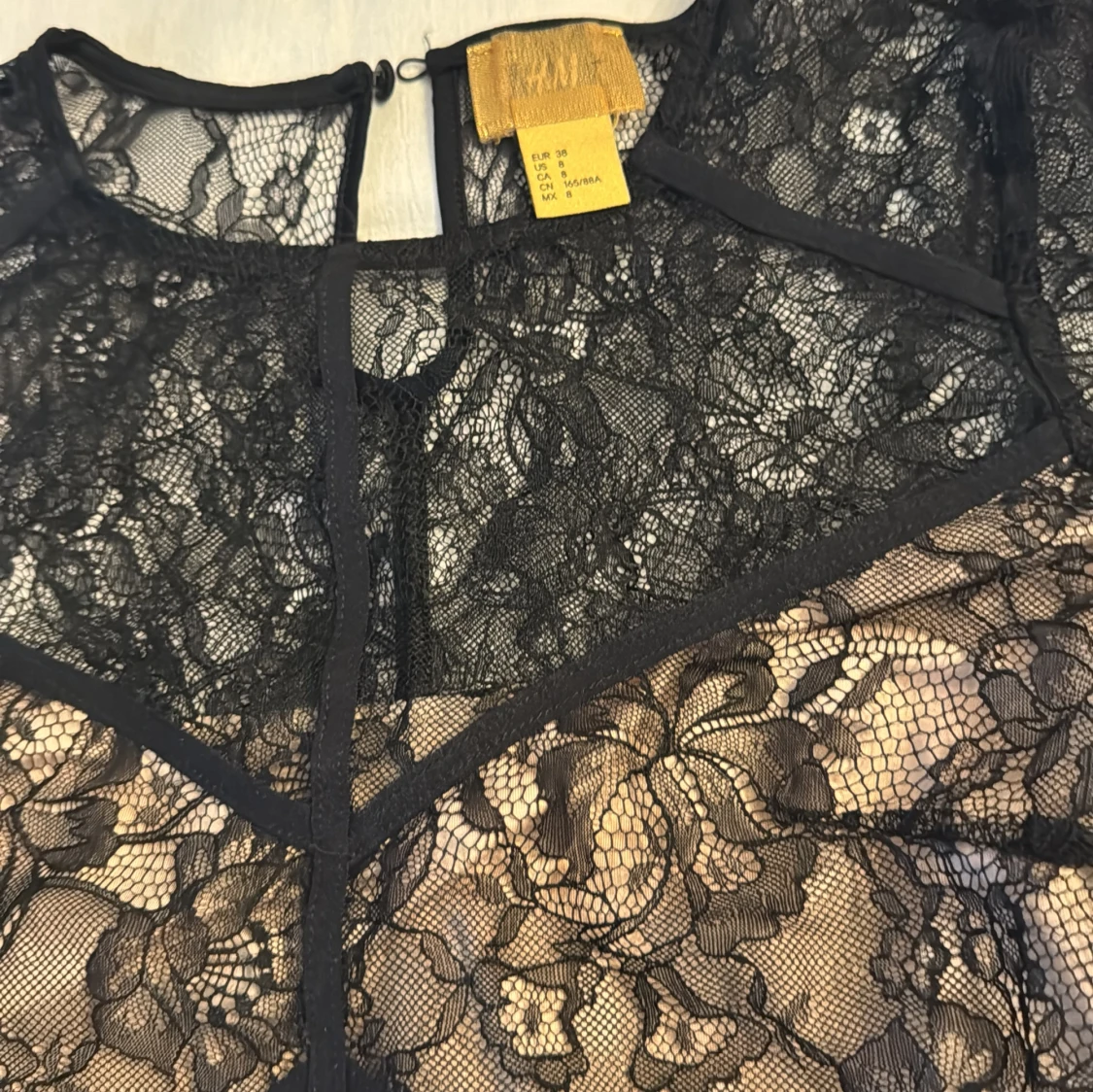 Elegant svart spetsbody från h&m med långärmad design och transparent spetsdetaljer. Perfekt för en stilfull look med en feminin touch. Stängs med knappar i ryggen.