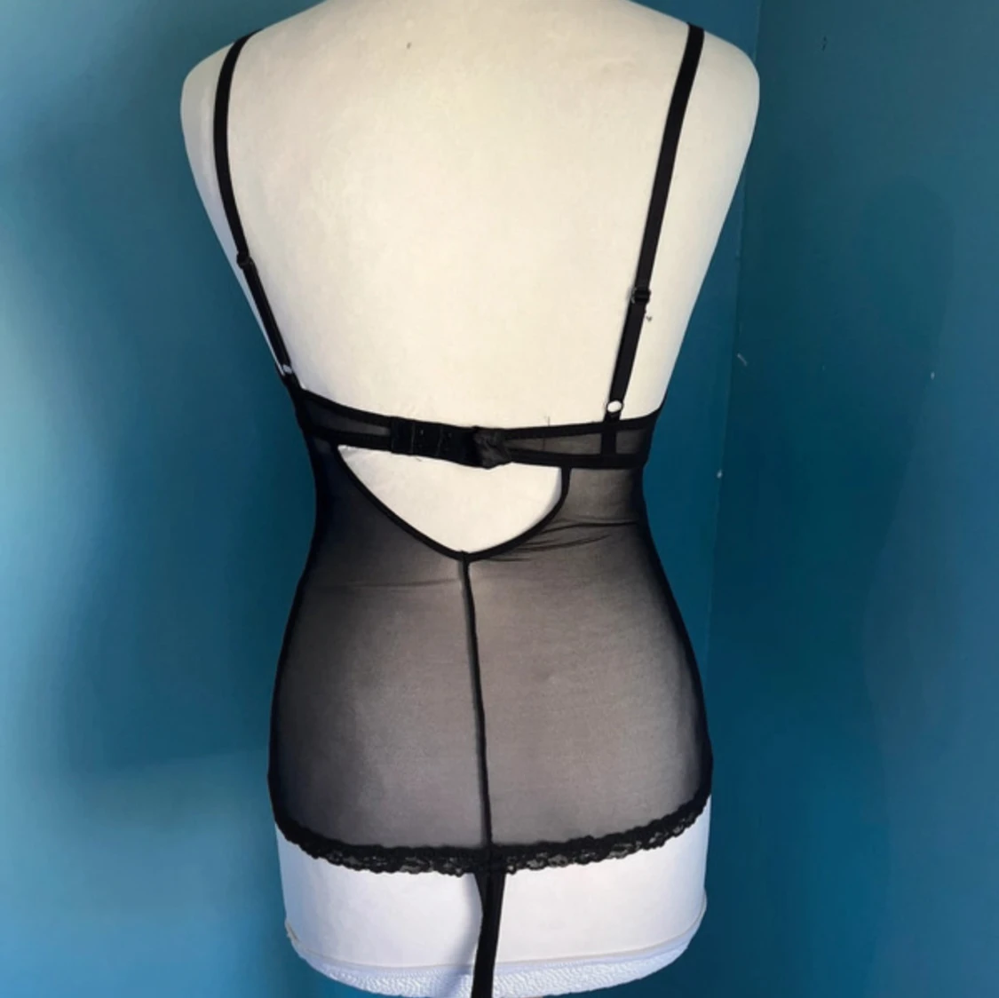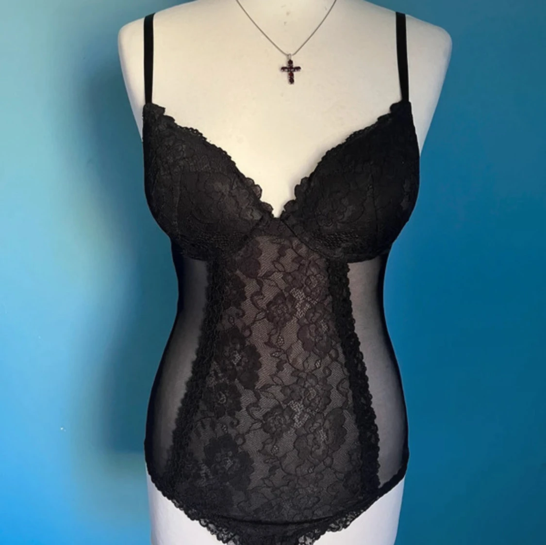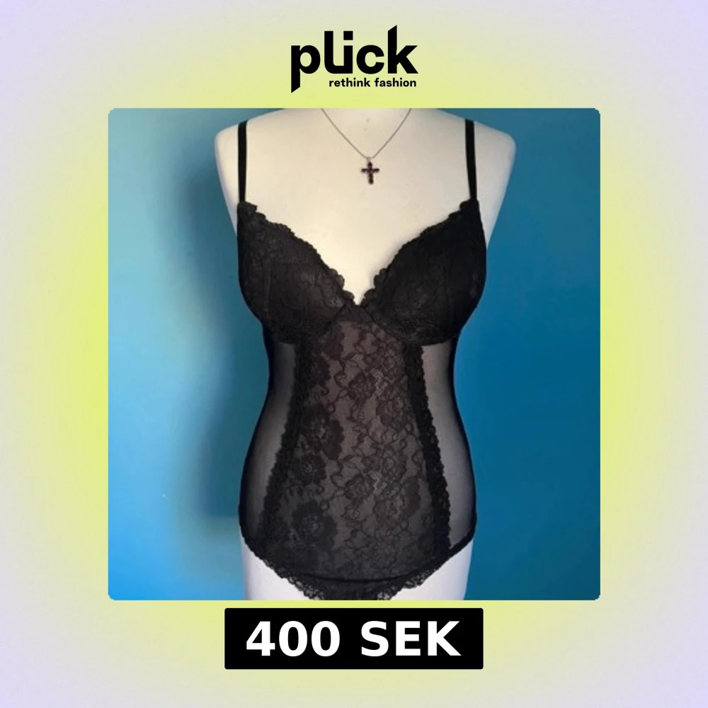 Säljer en svart body från H&M med genomskinliga meshpartier och blommig spets framtill. Axelbandslös look med smala justerbara axelband och vacker öppen rygg. Perfekt för att skapa en edgy och snygg stil. Materialet är polyester och polyamid.