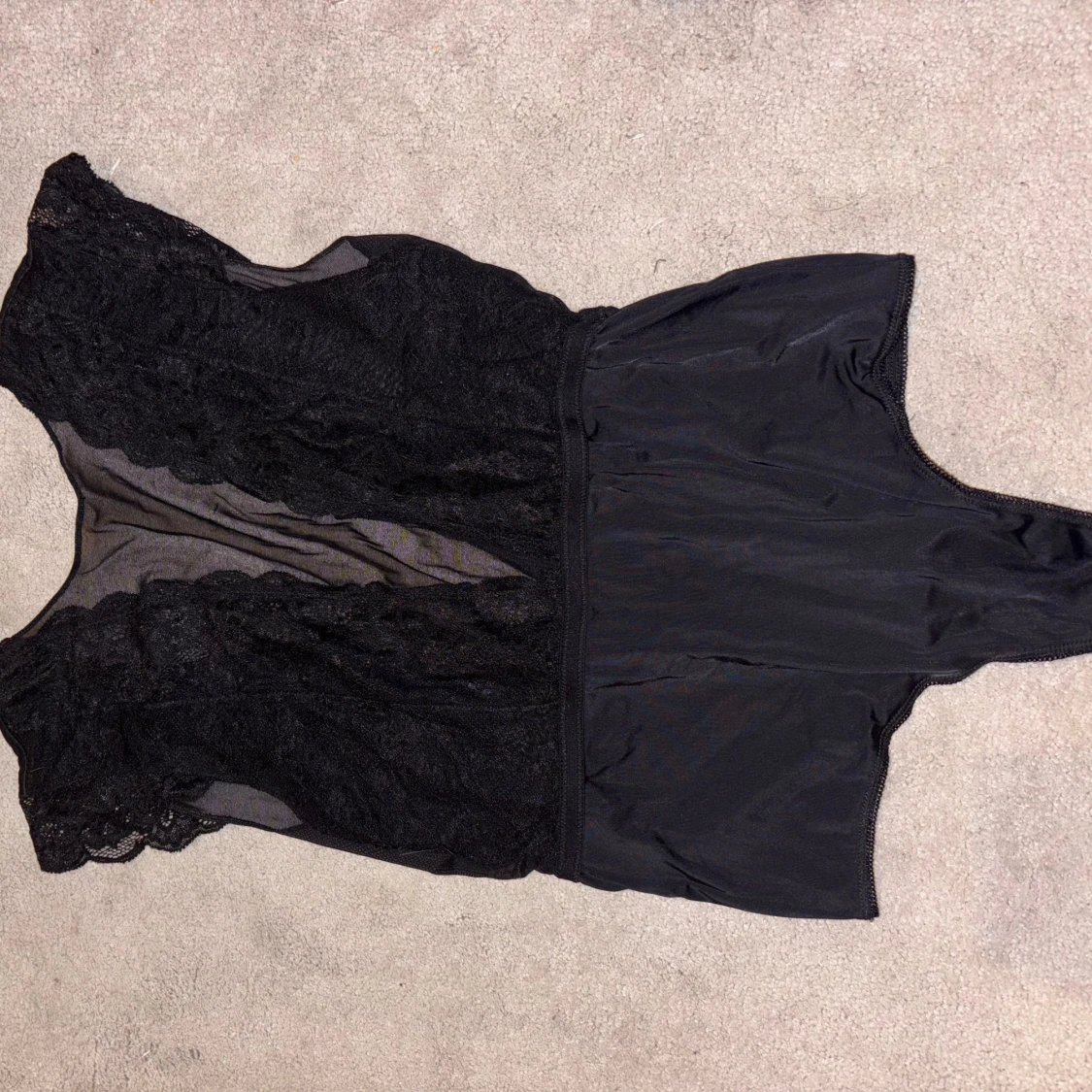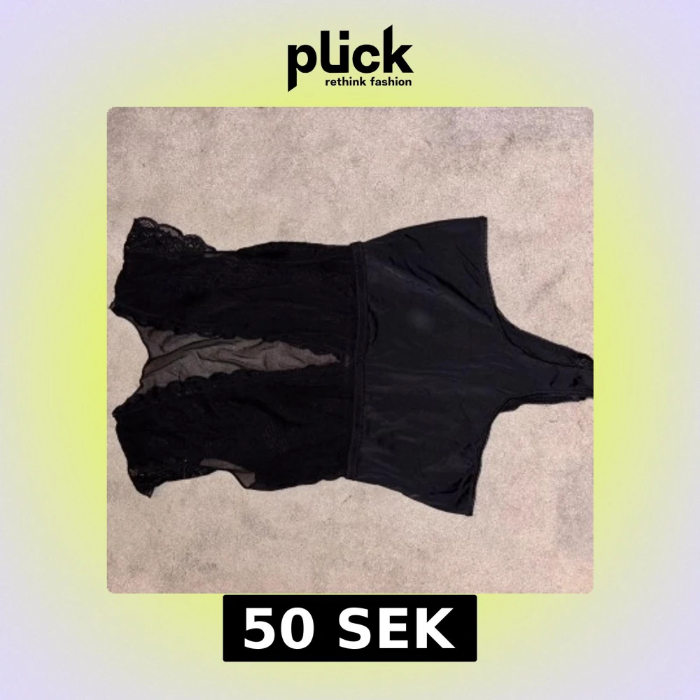 Säljer en svart body med snygga spetsdetaljer och transparenta partier framtill. Toppen har en ärmlös design och markerad midja, perfekt för att skapa en edgy look. Materialet är en mix av spets och syntet som ger en cool kontrast.