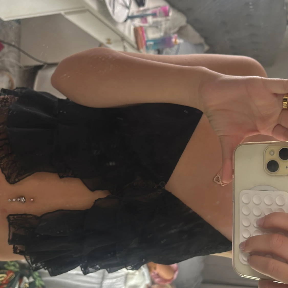 Säljer en svart croppad korsett-topp med spetsdetaljer och volanger. Toppen har en v-ringning, knappar framtill och är ärmlös med tunna axelband. Perfekt för dig som vill ha en edgy och trendig look.