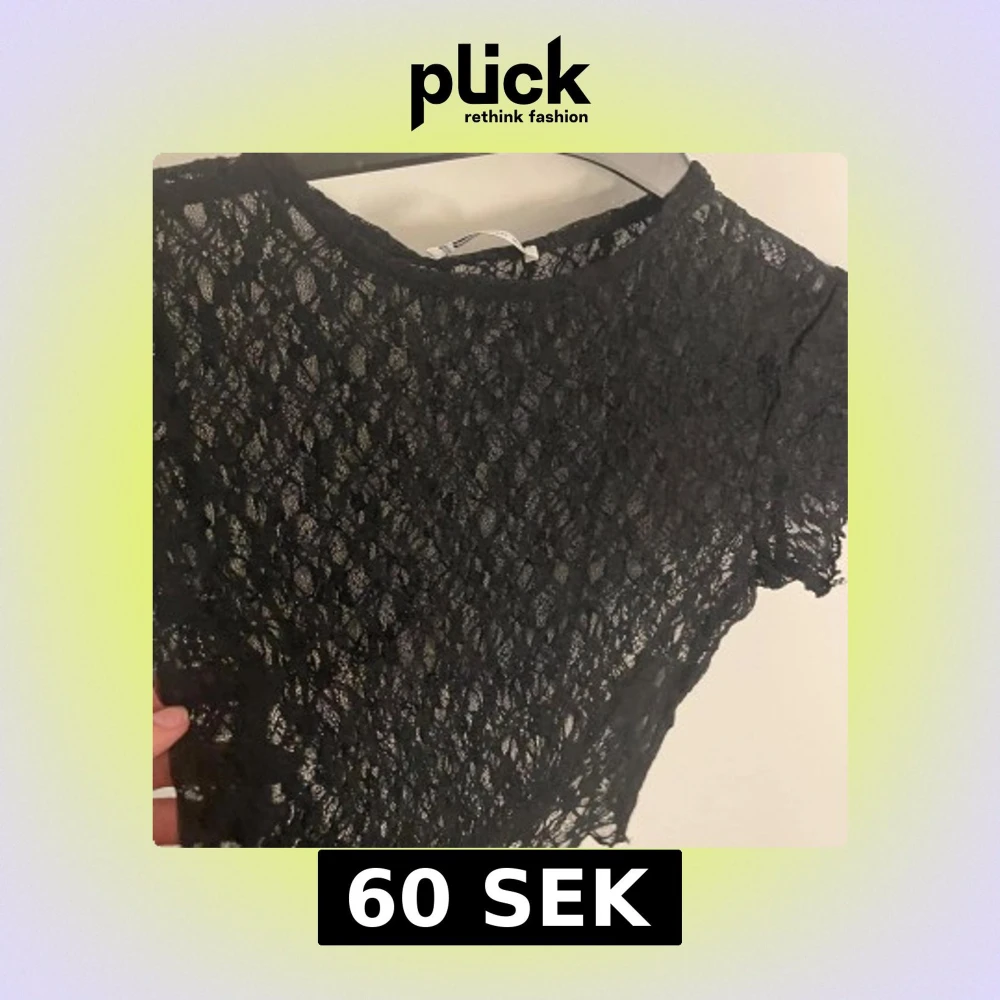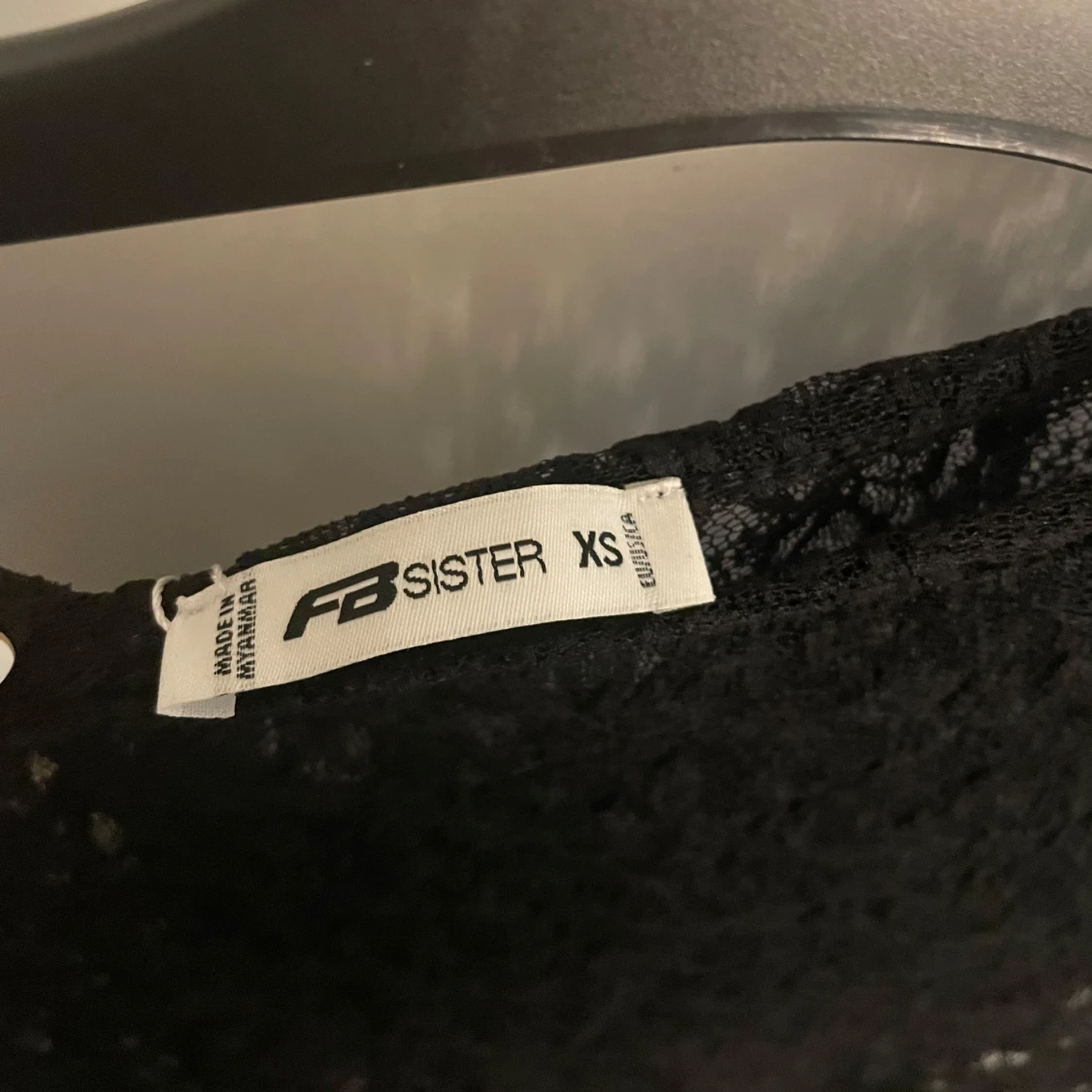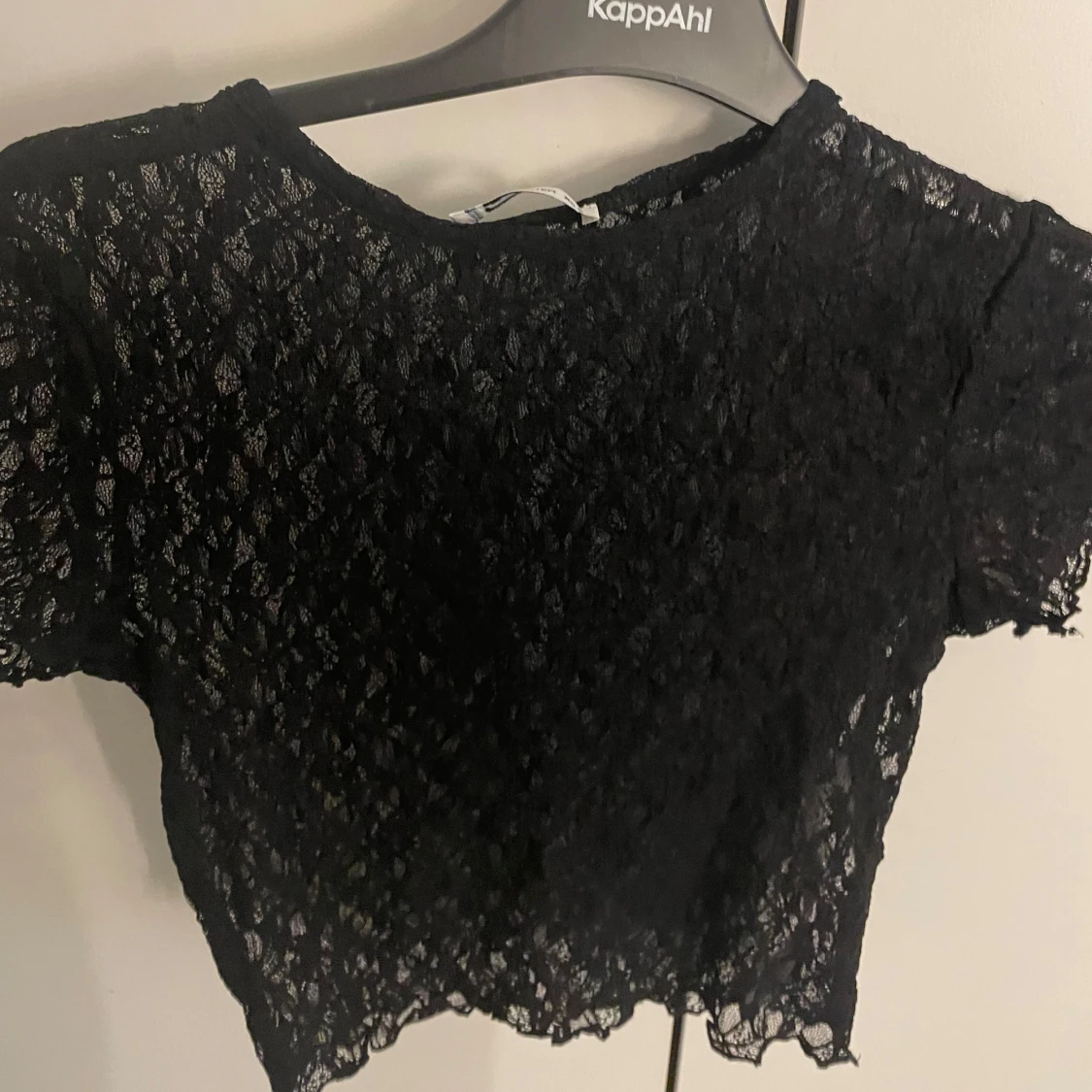Svart croppad topp från FB Sister i storlek XS. Hela toppen är i genombruten spets med korta ärmar och rund halsringning. Perfekt för att ge outfiten en edgy och trendig vibe.