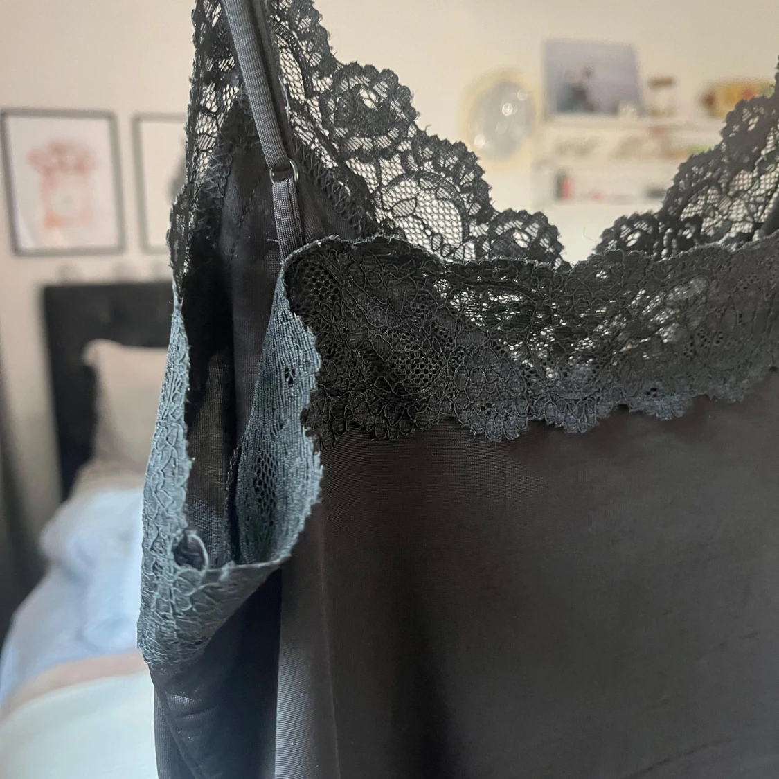 Säljer ett svart spetslinne från Object med vacker spets upptill och smala axelband. Axelbanden går att spänna åt och linnet sitter hyfsat tight. INGA DEFEKTER!!🖤🖤