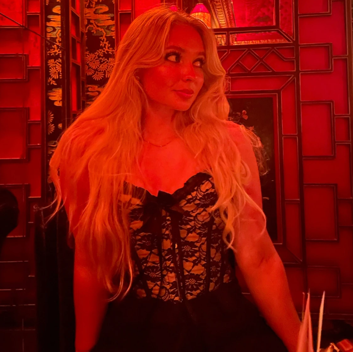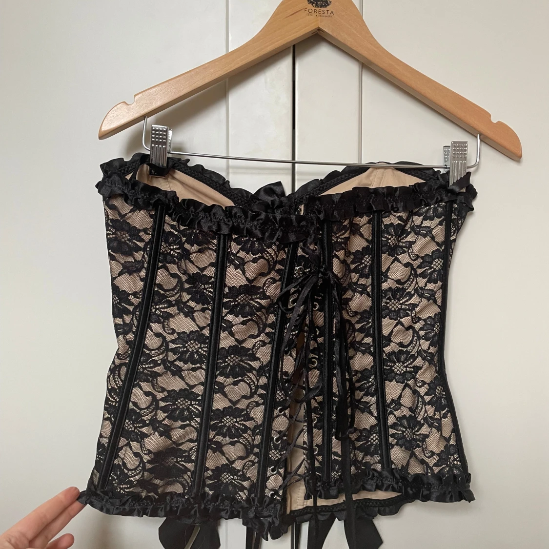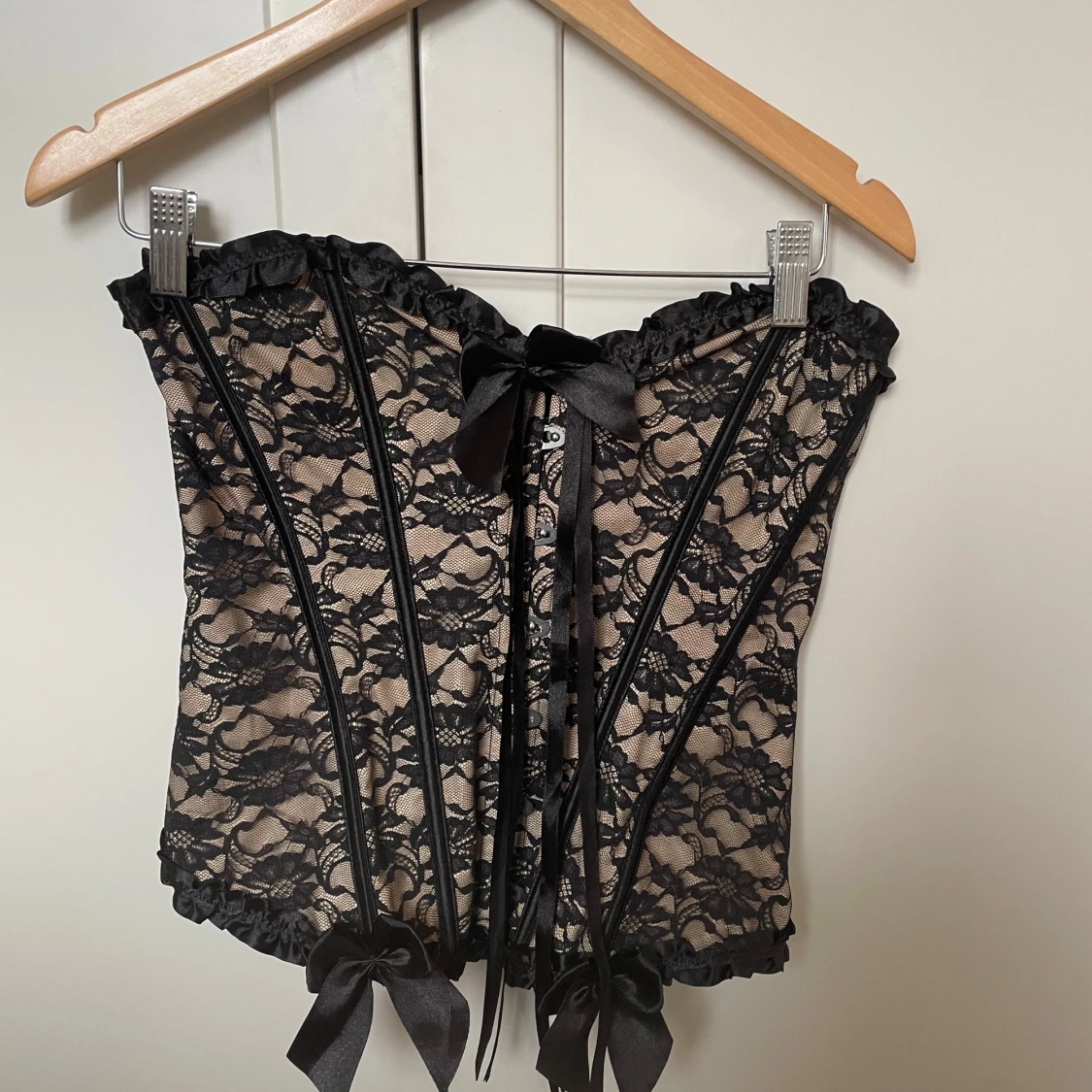 Elegant svart spetskorsett med vacker rosett framtill och snörning bak. Den har ett intrikat spetsmönster över en beige bas och dekorativa volanger längs kanterna. Perfekt för en stilfull look. Storleken kan justeras men skulle säga att den passar för S-M🫶❤️