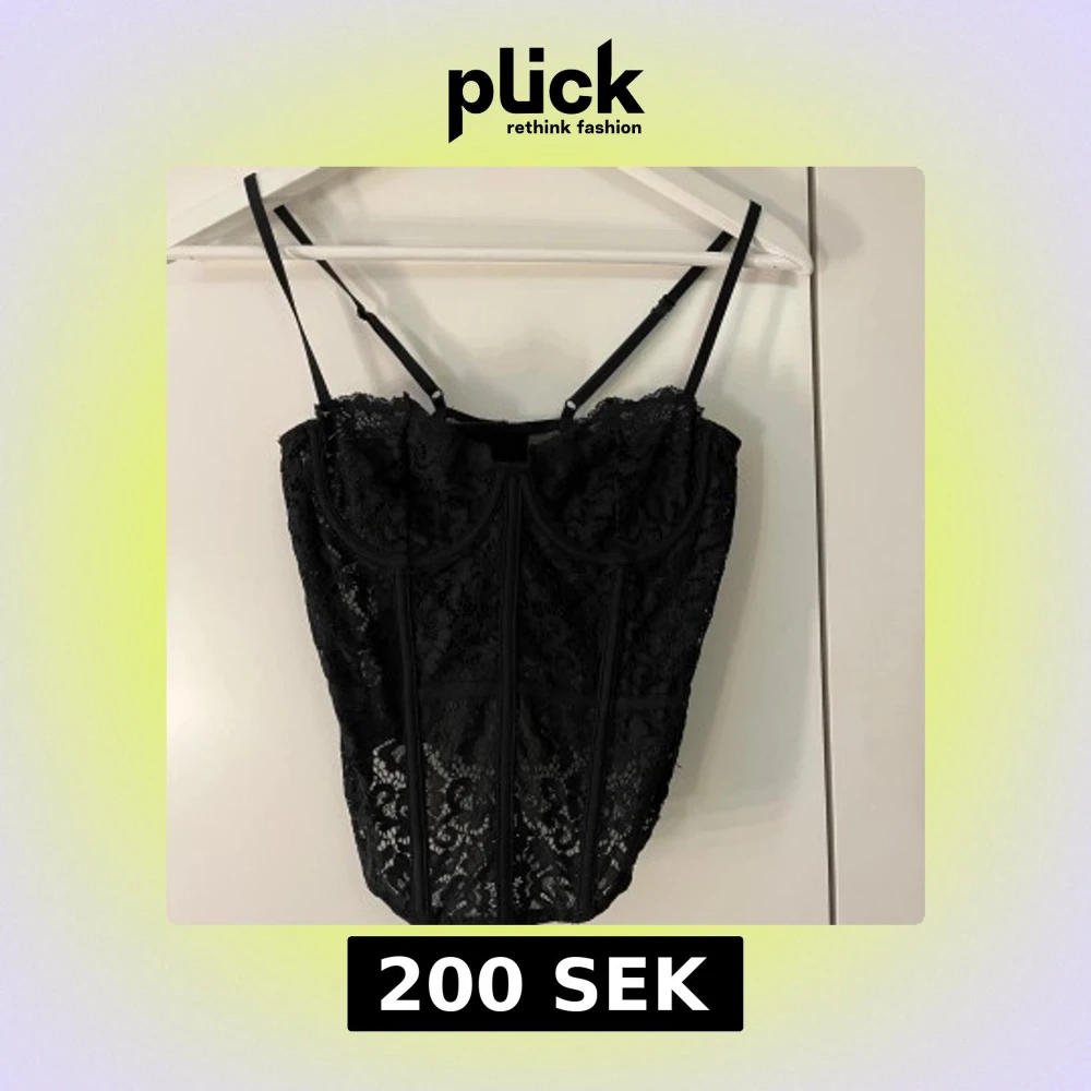 Snygg svart korsett med justerbara axelband och vacker spetsdetalj. Perfekt för en stilfull look. Passar bra till både jeans och kjol. Aldrig använd