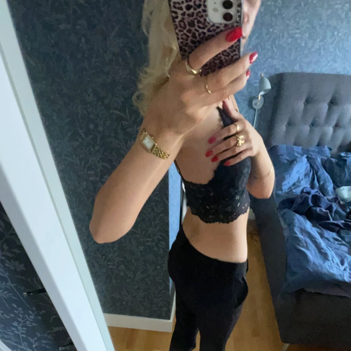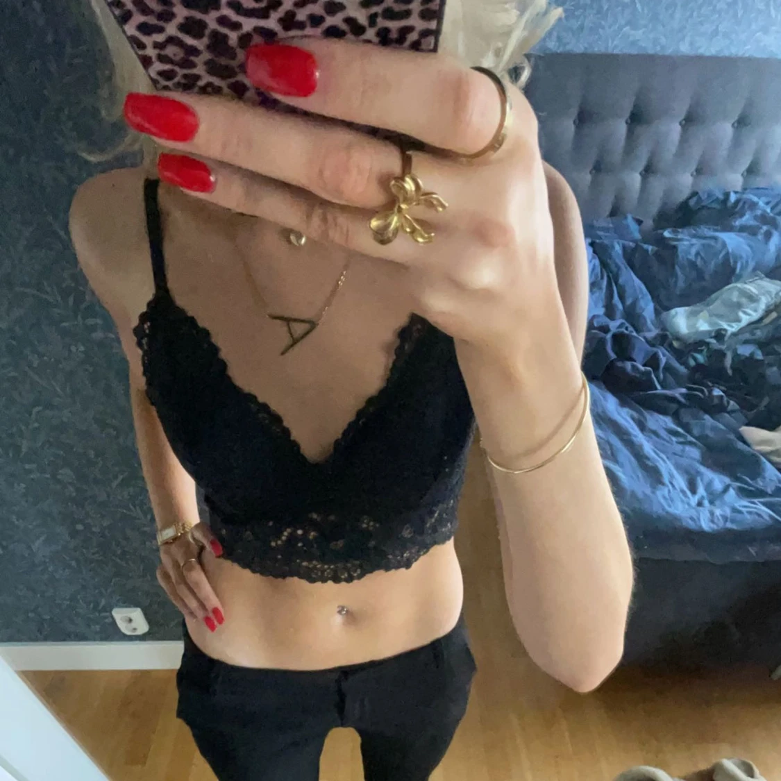 Säljer ett svart spetslinne med smala axelband och vacker spetsdetalj. Perfekt för en stilren och elegant look. Är en bralette och hade vart sjukt snyggt med en kavaj över.