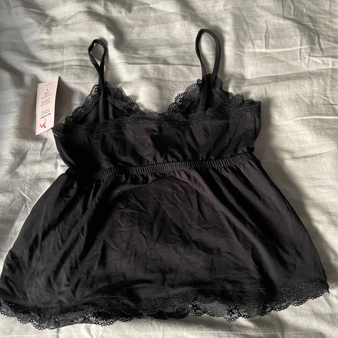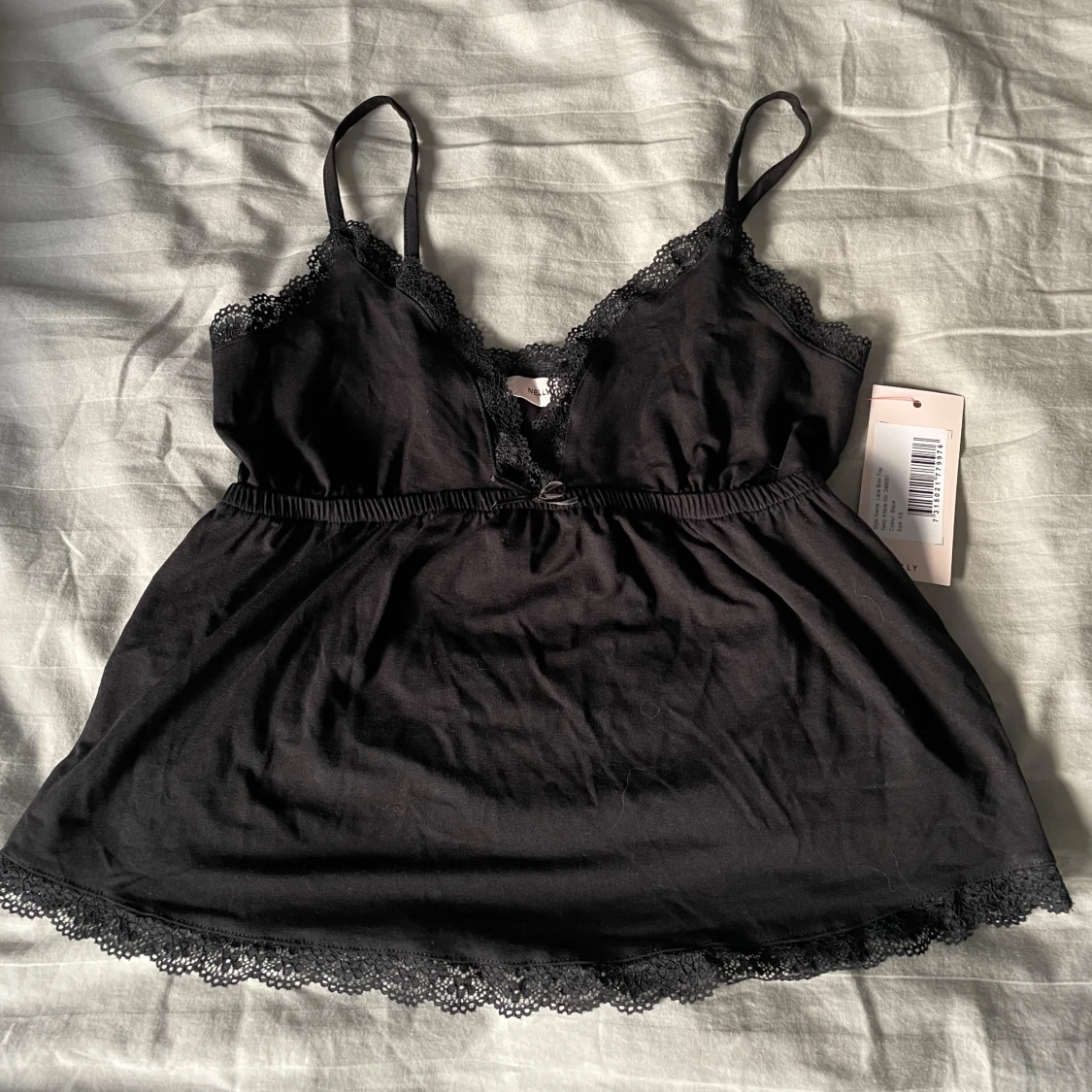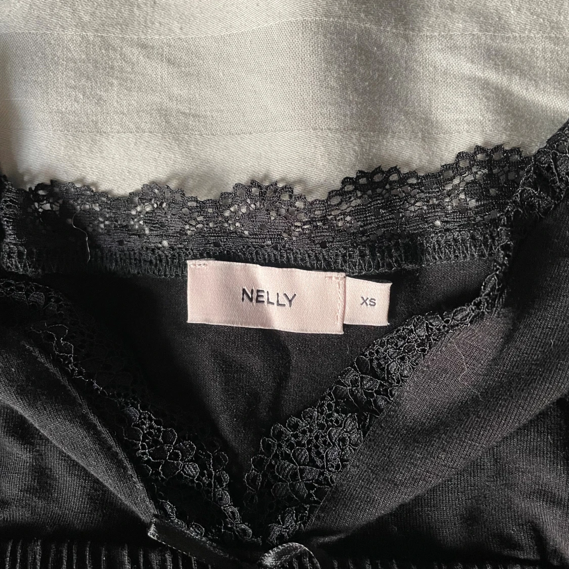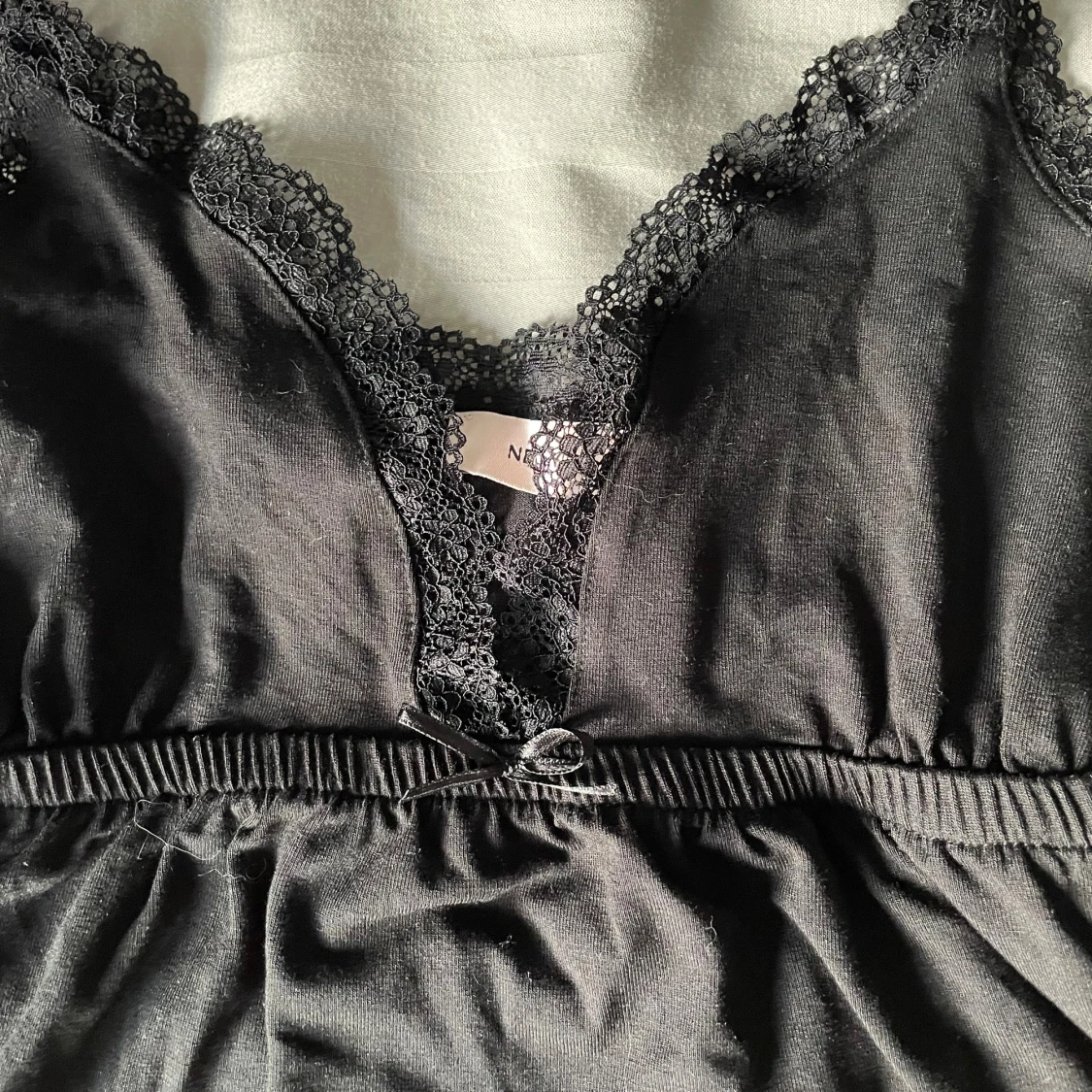 Supersöt svart linne-topp från Nelly med tunna axelband och v-ringning. Toppen har fina spetsdetaljer längs urringning och nederkant samt en liten rosett framtill. Har aldrig använt linne-toppen då den är lite stor på mig.
