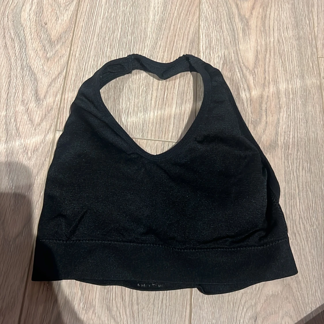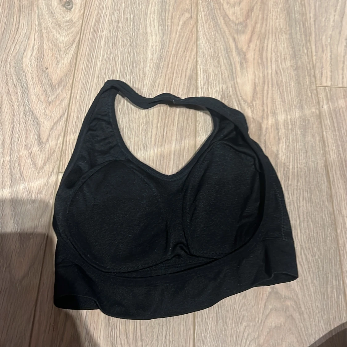 Säljer en svart sport-bh med brottarrygg. Den är perfekt för träning och har en bekväm passform. Materialet är stretchigt och andas bra.