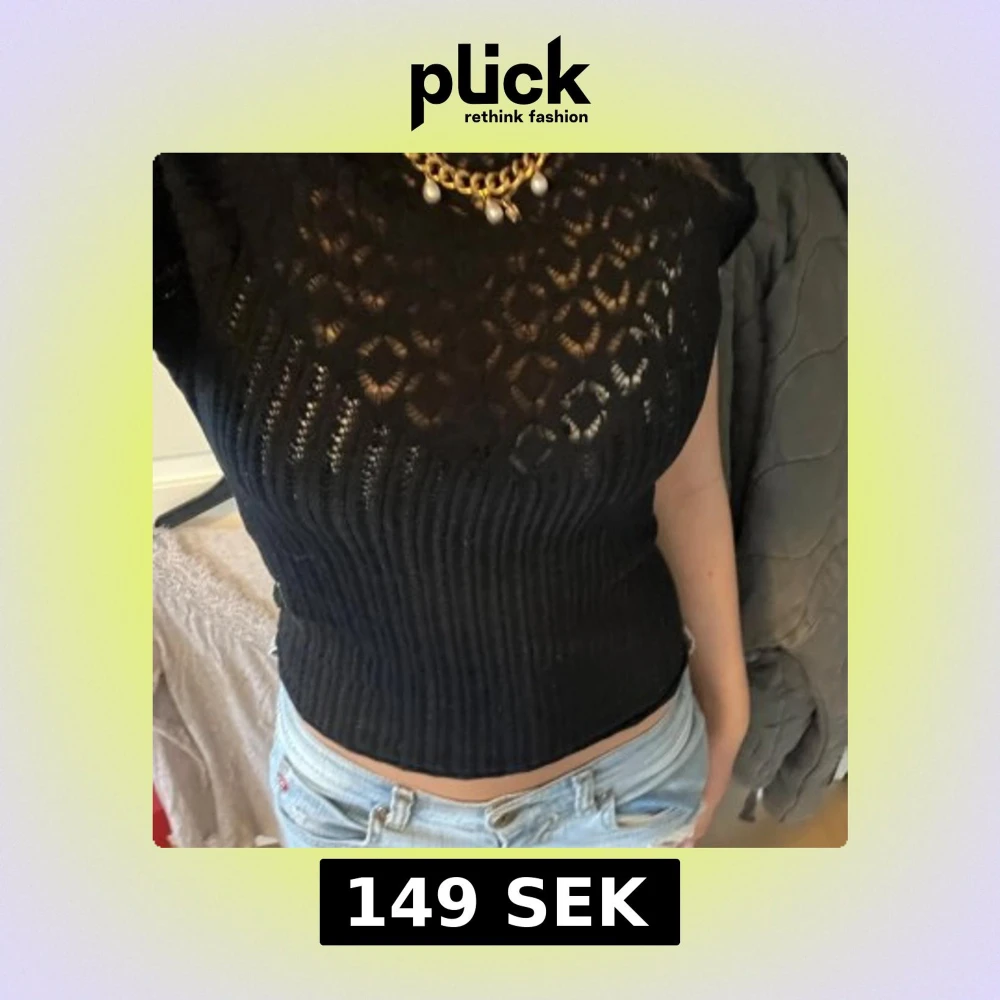 Snygg svart stickad spets topp med korta ärmar och ett genombrutet mönster upptill. Toppen är ribbad nertill och har en rund halsringning. Perfekt att styla med jeans eller kjol för en trendig look. Lappen är avklippt då man hade sett den i ryggen annars.