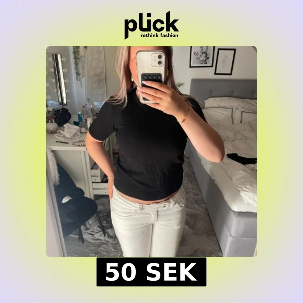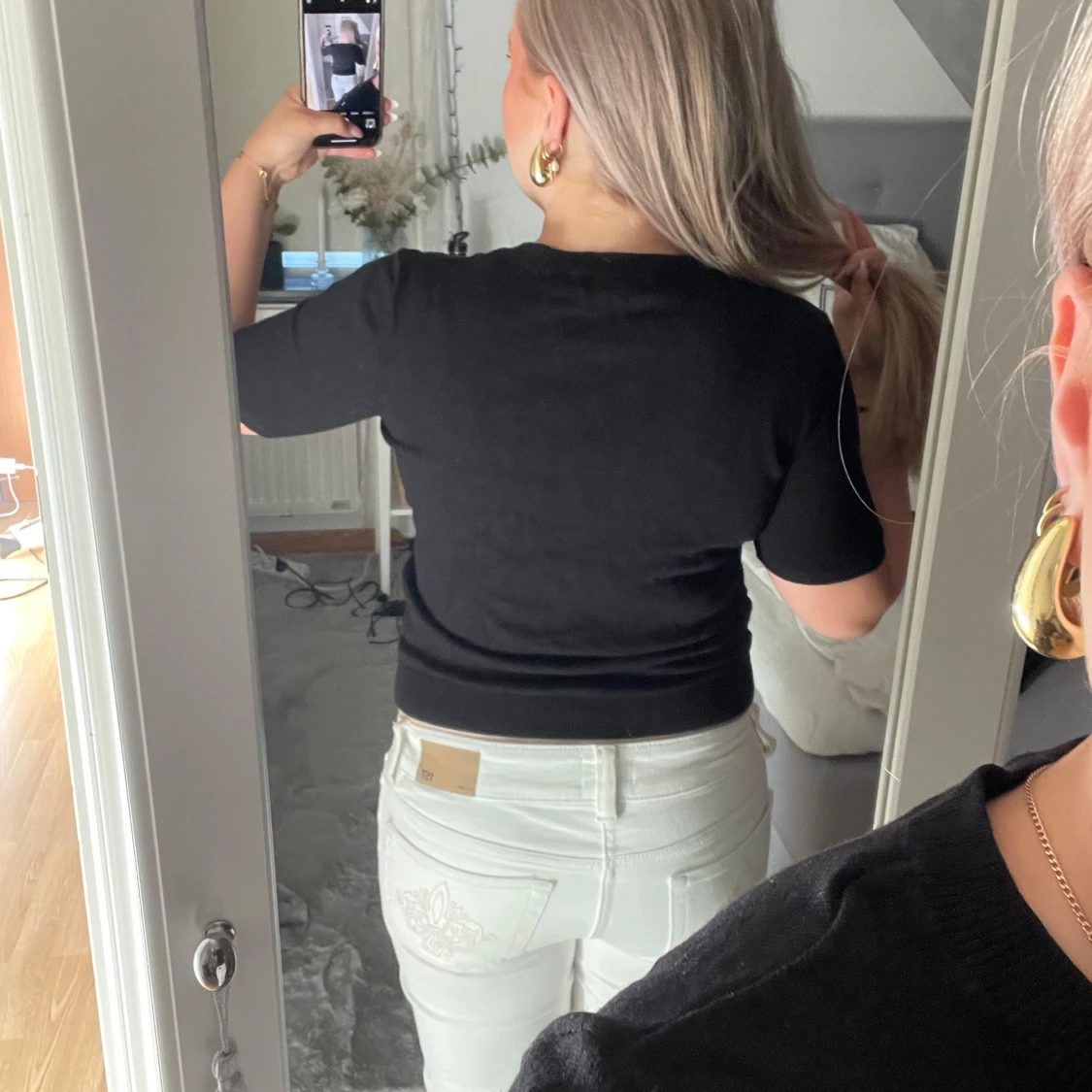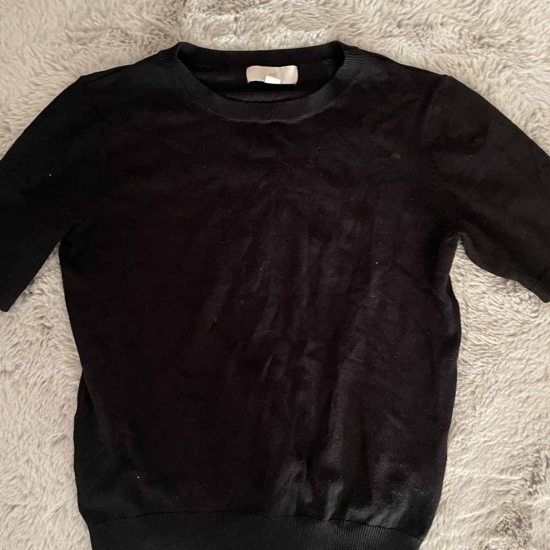 En svart, enkel stickad topp med rund hals och korta ärmar. Modellen har ribbade kanter vid halsringning, ärmslut och nederkant. Perfekt att styla med jeans eller kjol för en clean look.