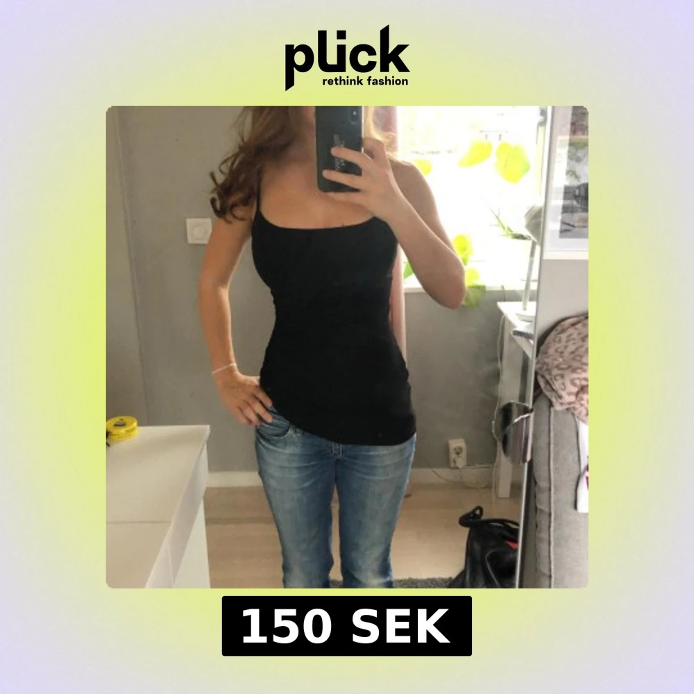 Säljer en svart, figurnära linnetopp med smala axelband och rak urringning. Toppen är enkel och stilren, perfekt att matcha med jeans eller kjol. Materialet känns mjukt och stretchigt för en bekväm passform🥰
