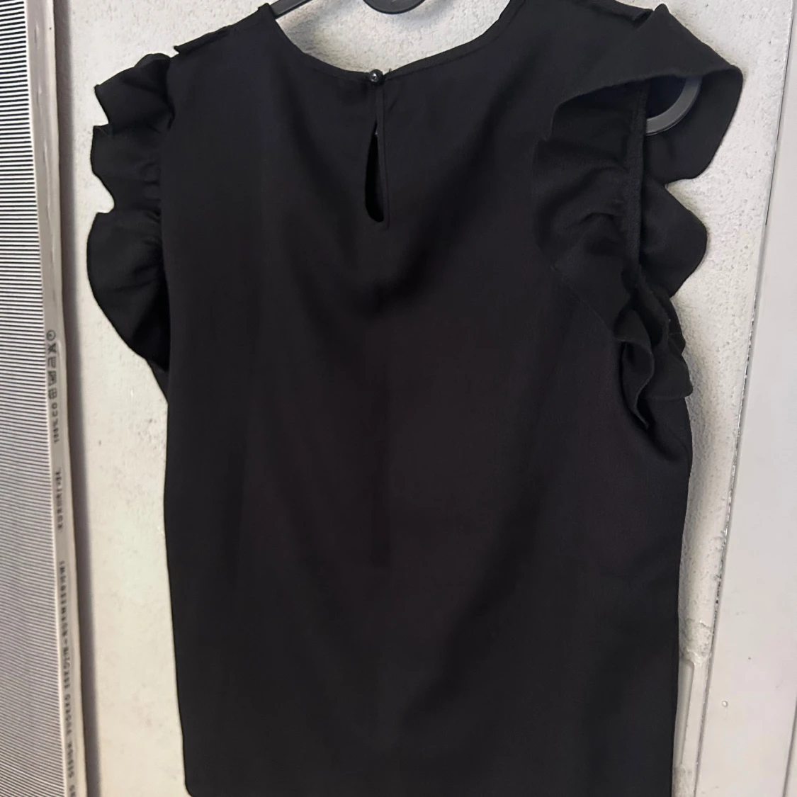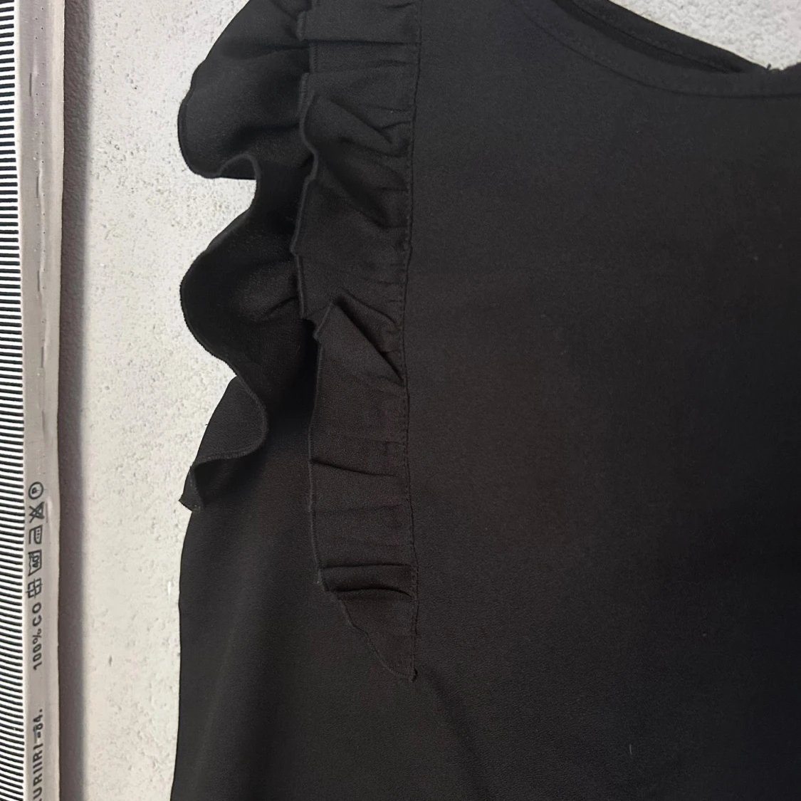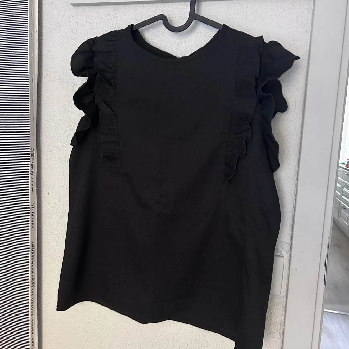 Säljer en svart Top med rund hals och snygga volangdetaljer på axlarna. Toppen är ärmlös och har en enkel knapp i nacken. Perfekt för dig som gillar stilrena plagg med en twist.