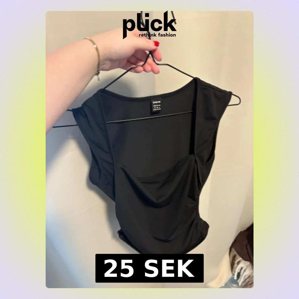 Säljer en svart, stilren topp från SHEIN i storlek S. Toppen har en cool draperad detalj framtill och har en tight passform. Perfekt att styla med jeans eller kjol för en trendig look. Materialet är mjukt och stretchigt syntet.