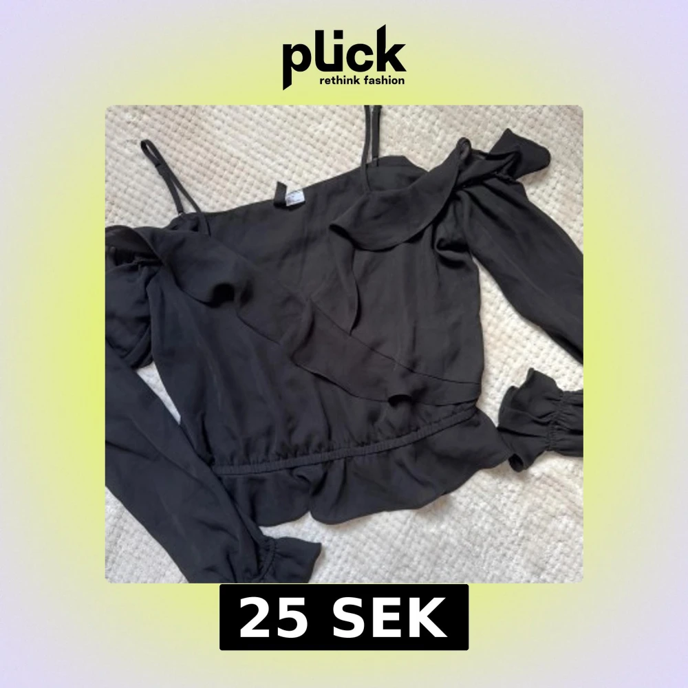 Svart omlottopp med volangdetaljer och långa ärmar. Toppen har smala axelband med offshoulder design 🖤Storlek M men är mer som en S