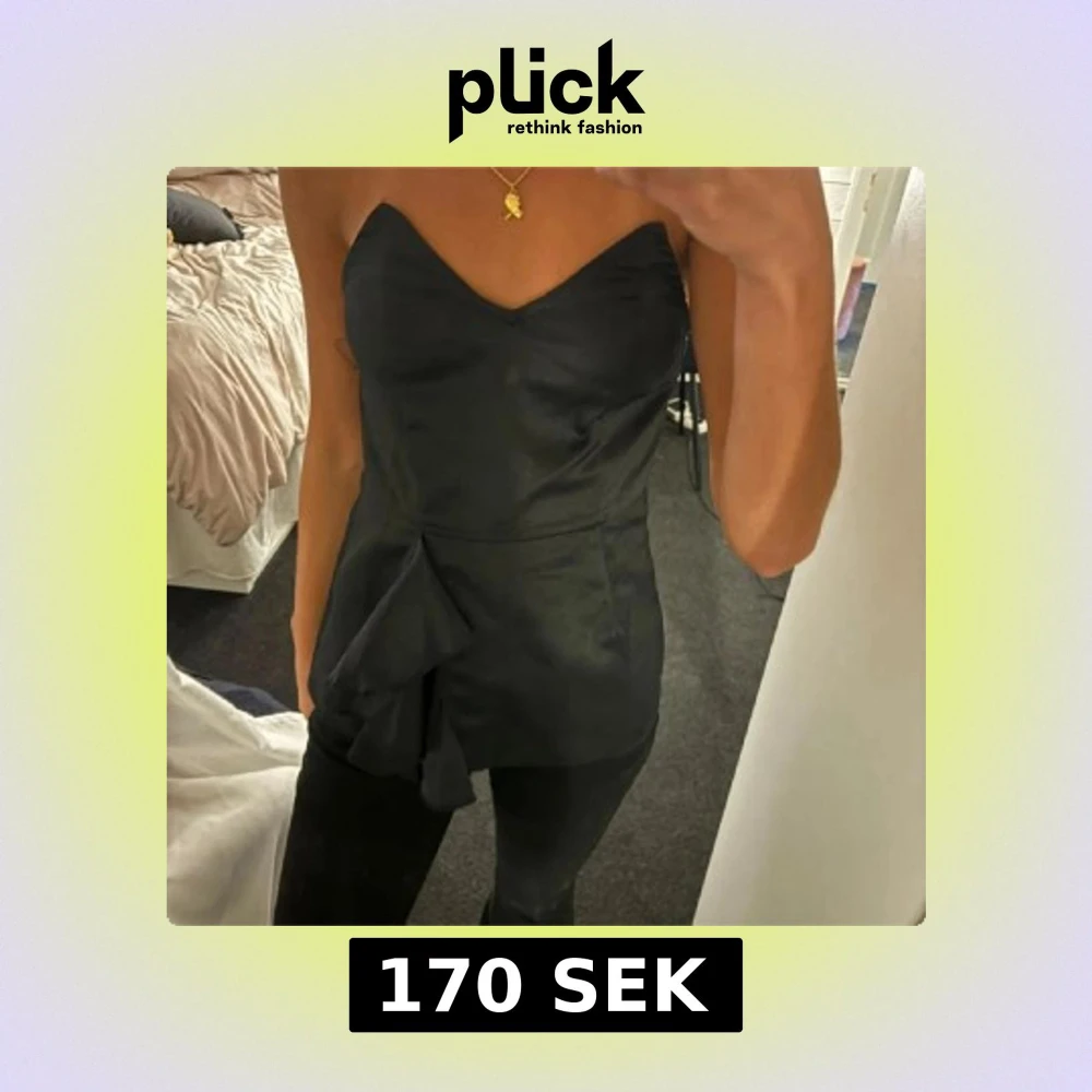 Snygg svart axelbandslös topp i satinliknande material med v-ringad urringning och dekorativ knytning i sidan.