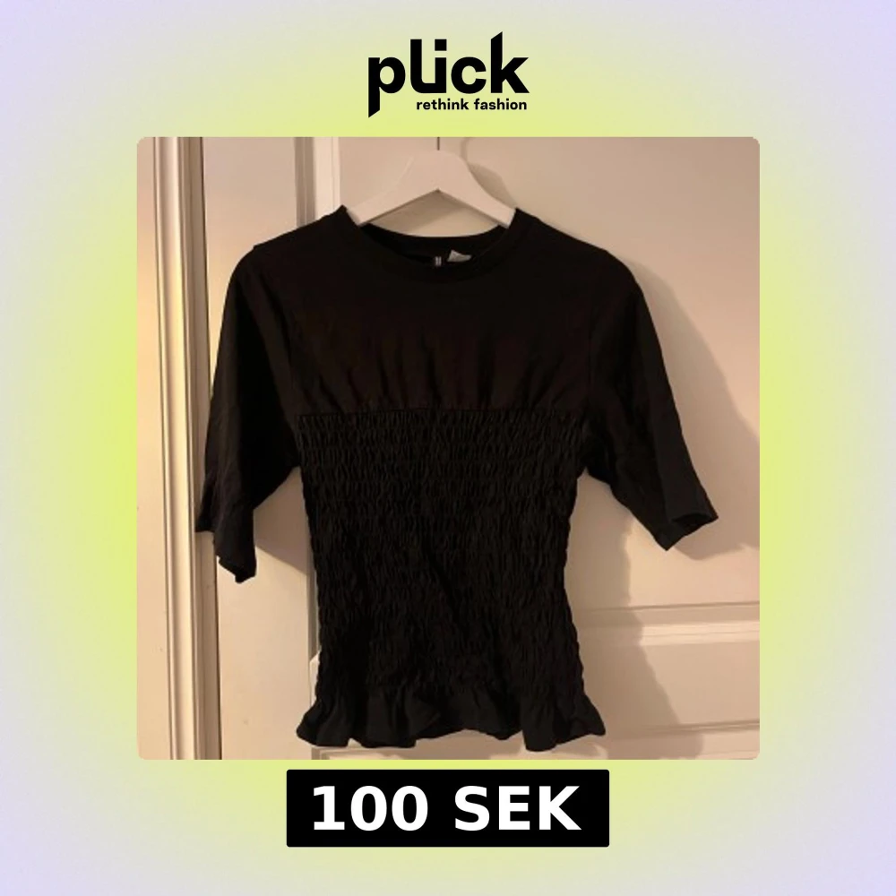 Säljer en svart topp från H&M Divided med smockdetaljer och volangkant. Toppen har korta ärmar och en rund halsringning. Perfekt för en stilren look.